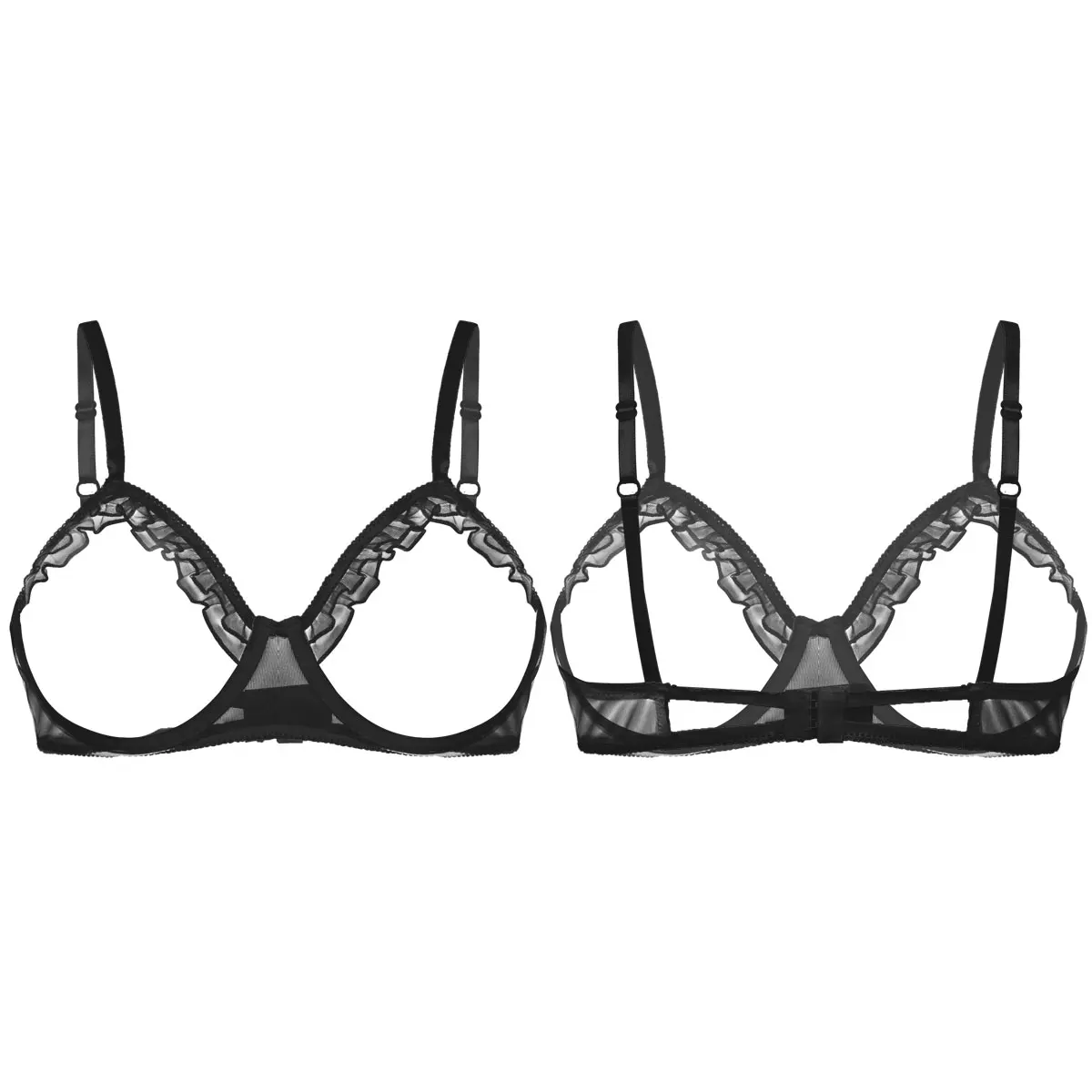 Женский прозрачный бюстгальтер, Эротическое нижнее белье из прозрачной сетчатой ткани, бюстгальтеры с регулируемыми бретелями-спагетти, с открытой грудью и оборками на косточках