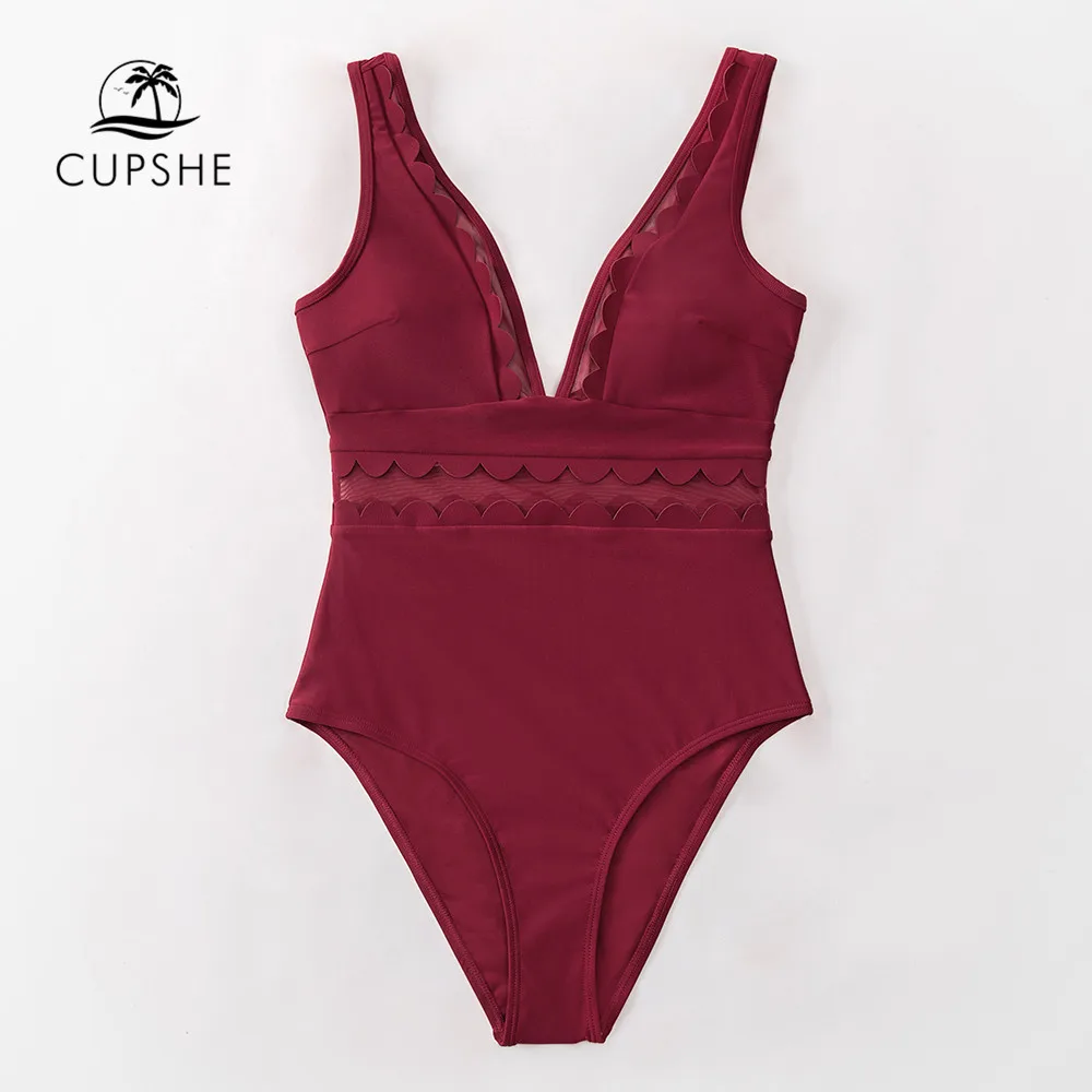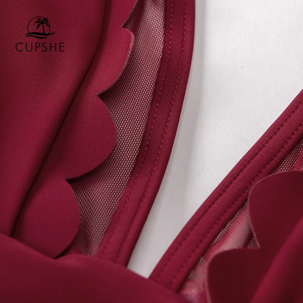 CUPSHE сплошной темно-красный волнистый край декольте цельный купал...