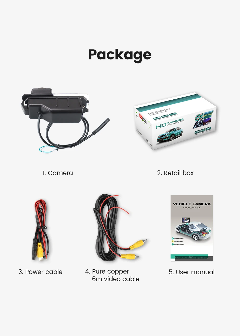 1. Камера заднего вида2. Розничная коробка3. Кабель питания4. Чистый медный 6 м видео кабель5. Руководство пользователя