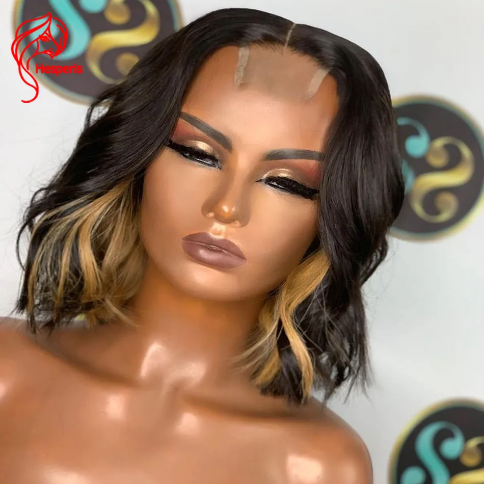 Hesperis хайлайтер светлые человеческие волосы парики предварительно выщипанные 5,5x4,5 искусственный шелк на основе застежки кружевной парик бразильские Реми Короткие Волнистые кружевные парики