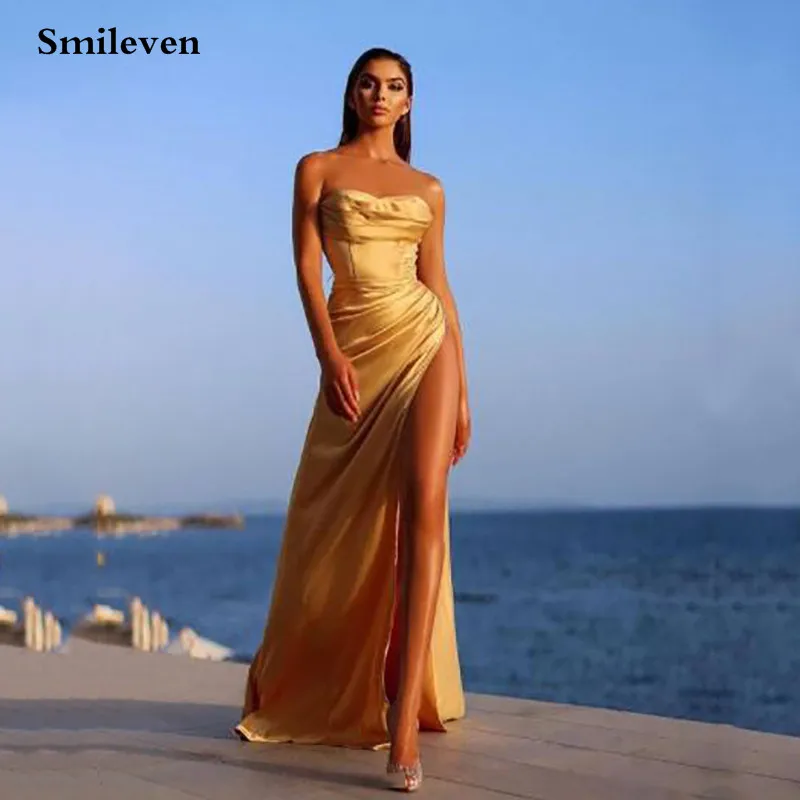 Женское вечернее платье без бретелек, с высоким разрезом сбоку