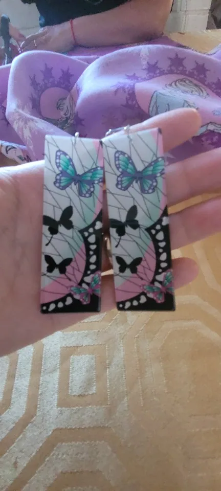 Los aros son preciosos, de material acrílico. Son de buen tamaño y el enganche a la oreja queda perfecto. Llegaron muy rápido a Chile, recomiendo al vendedor
