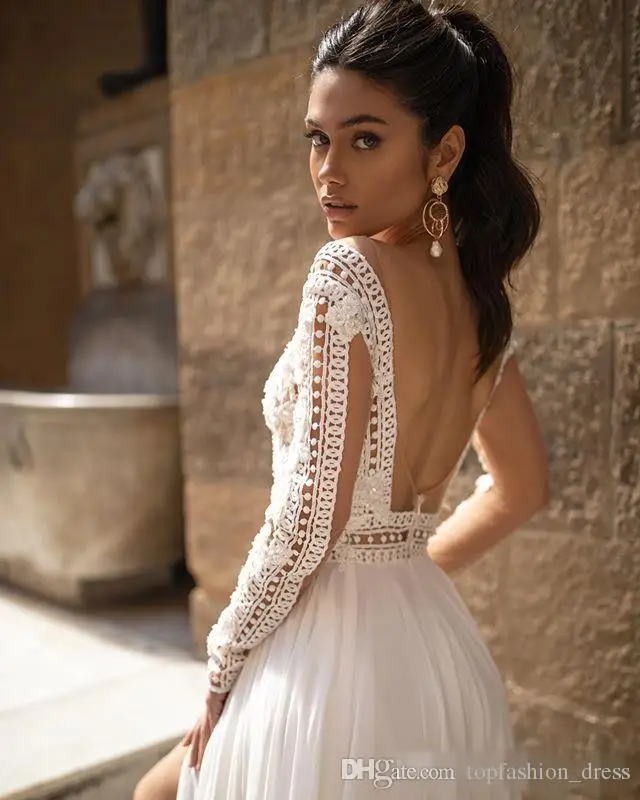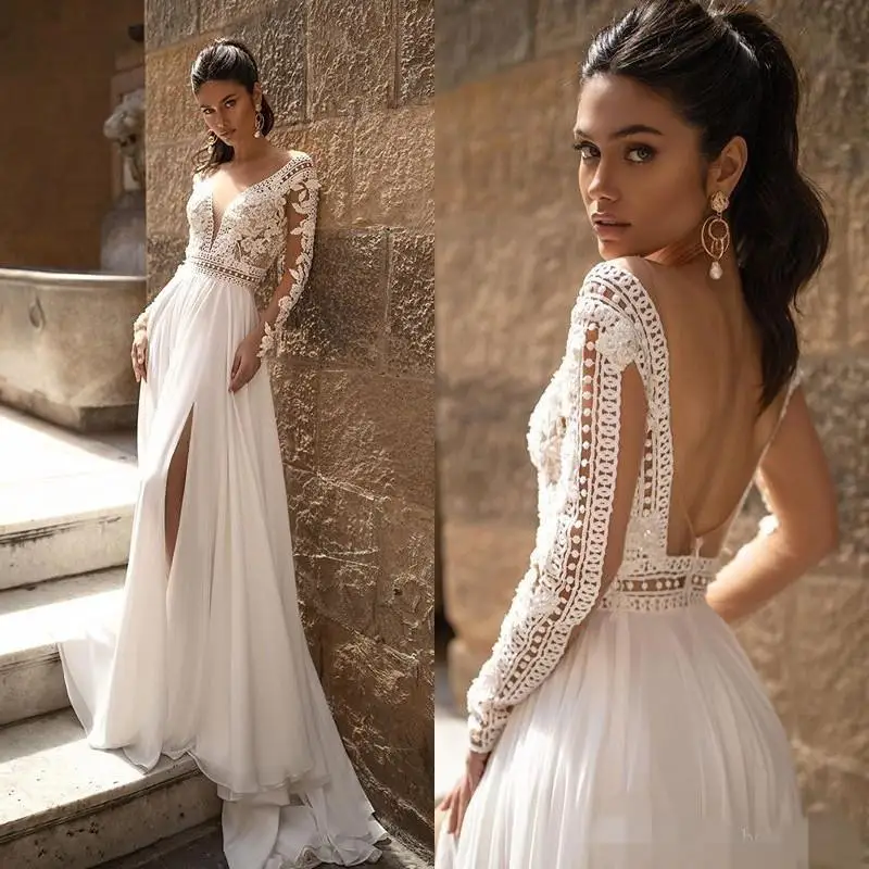 Женское свадебное платье с длинными рукавами, кружевное платье невесты с открытой спиной и шлейфом, расшитое бисером, в стиле бохо, свадебное платье