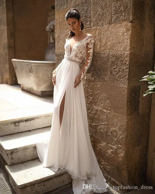 Кружевное шифоновое свадебное платье в стиле бохо, с длинным рукаво...