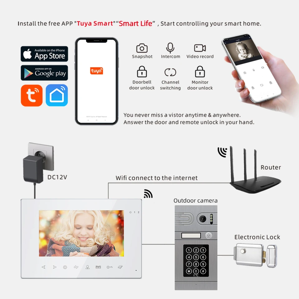 Подключитесь к приложению Tuya smarthome, вы можете дистанционно управлять монитором, снимать фото или видеозапись. Вы можете поговорить со своими посетителями и разблокировать их.Все эти действия, вы можете закончить их своим мобильный телефон.