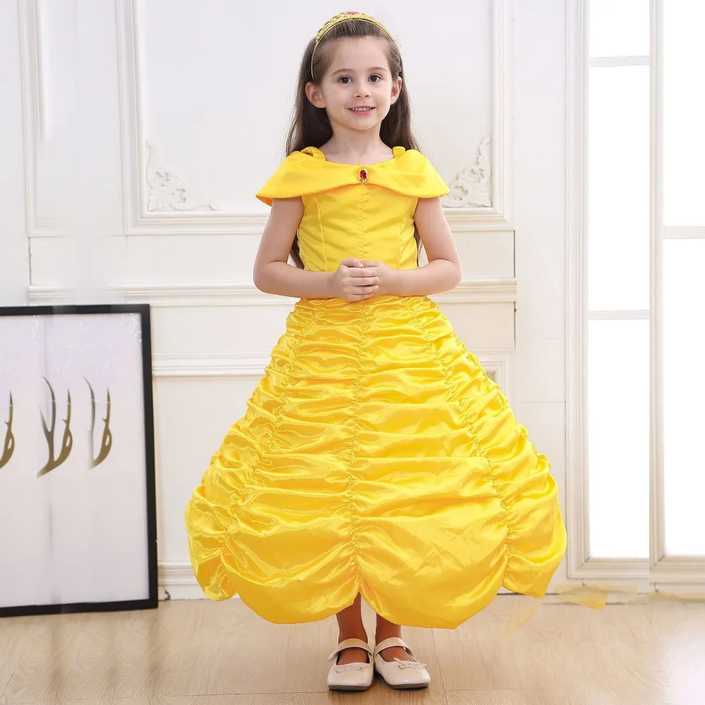 Новое платье Белль для девочек, нарядное детское желтое бальное платье с цветочным рисунком, Детский карнавальный костюм Белла Красавица и Чудовище вечерние платья для малышей