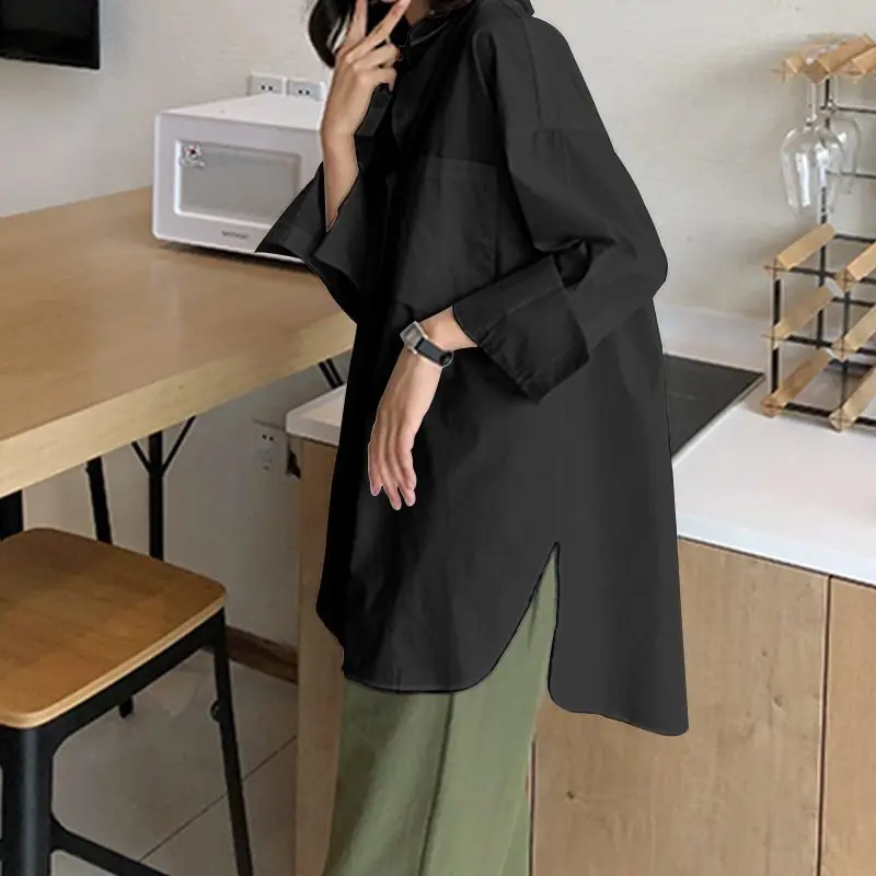 Женская Асимметричная блузка на пуговицах, повседневная Однотонная рубашка с отложным воротником и длинным рукавом, большие размеры, осень 2021