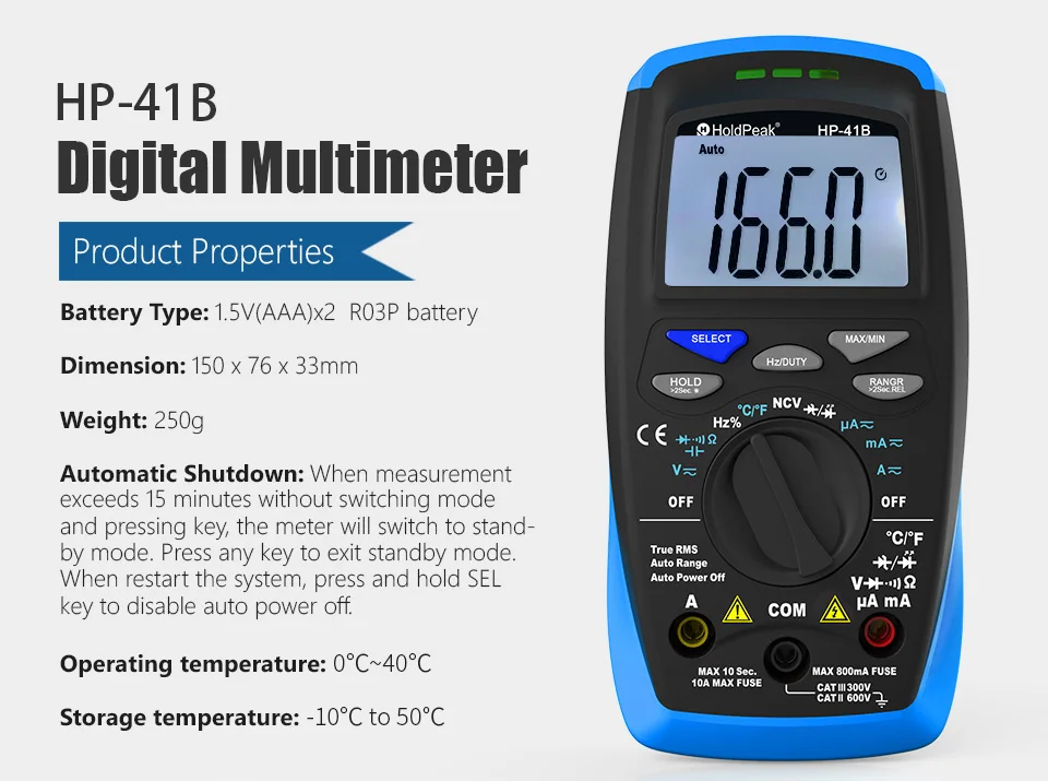 Модель HP-41BНапряжение постоянного тока 600 мВ ~ 600 вAC Напряжение 6V ~ 600VПостоянный ток 600μA ~ 10AТок переменного тока 600μA ~ 10AСопротивление 600Ω ~ 60MΩЕмкость 6nF ~ 60mFЧастота 9,999 Гц ~ 9,999 МГцРабочий 0.1% ~ 99.9%Дисплей 6000Выбор диапазона автоТест на диод √Непрерывный звуковой сигнал √Хранение данных √Задний светильник √Автоматическое выключение √NCV √True RMS √Относительное значение √Относительное значение √