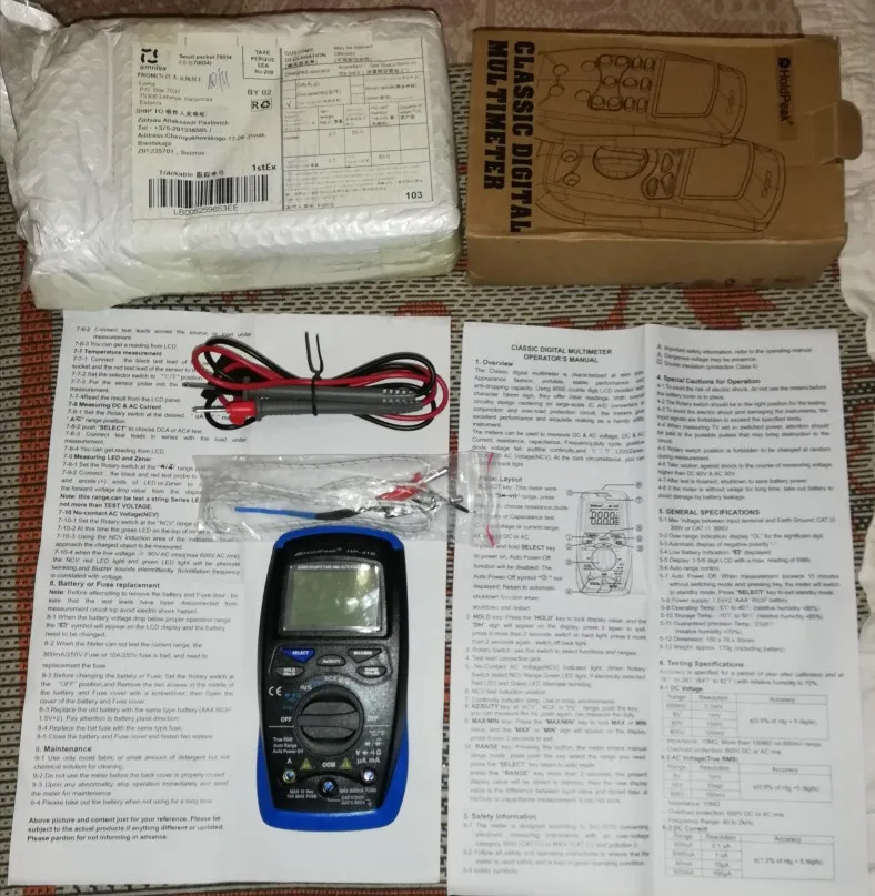 1 * 41B цифровой мультиметр1 * Тестовый свинец1 * Руководство по эксплуатацииПримечание:Стандартная посылка не включает аккумуляторы. Потому что международная воздушная доставка не позволяет отправить жидкость, порошок и батареи, мы не можем поместить их в посылка. Надеюсь, вы понимаете, что можете купить их в вашем местном магазине или супермаркете. Спасибо за вашу поддержку!