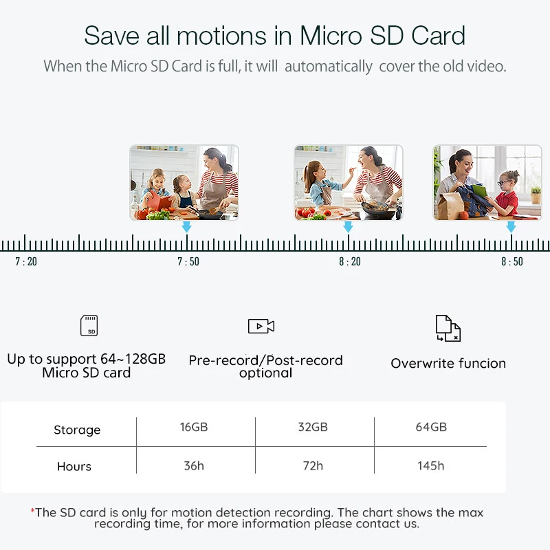 Very good video quality day and night. It moves 360 degrees and can be controlled with mobile phone and it gives notifications when it detects movement.