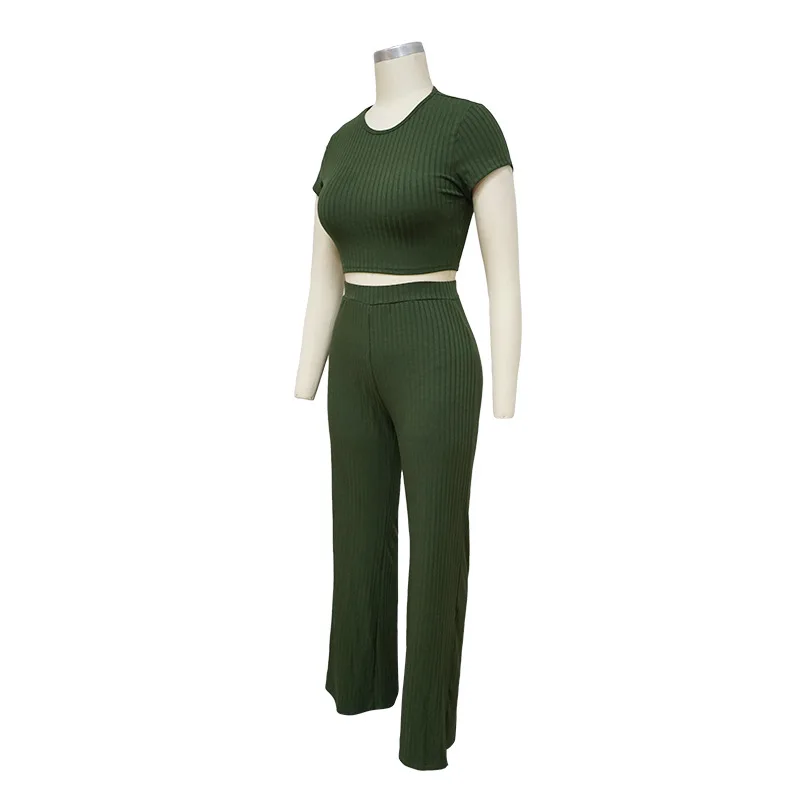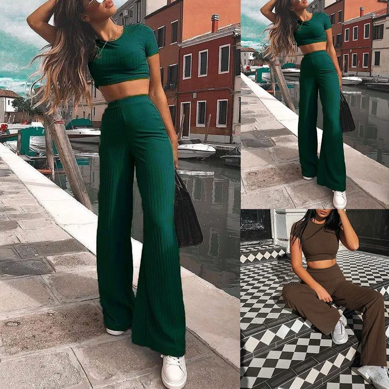 Женский трикотажный комплект из двух предметов, укороченный Топ с длинным рукавом и круглым вырезом и брюки с широкими штанинами