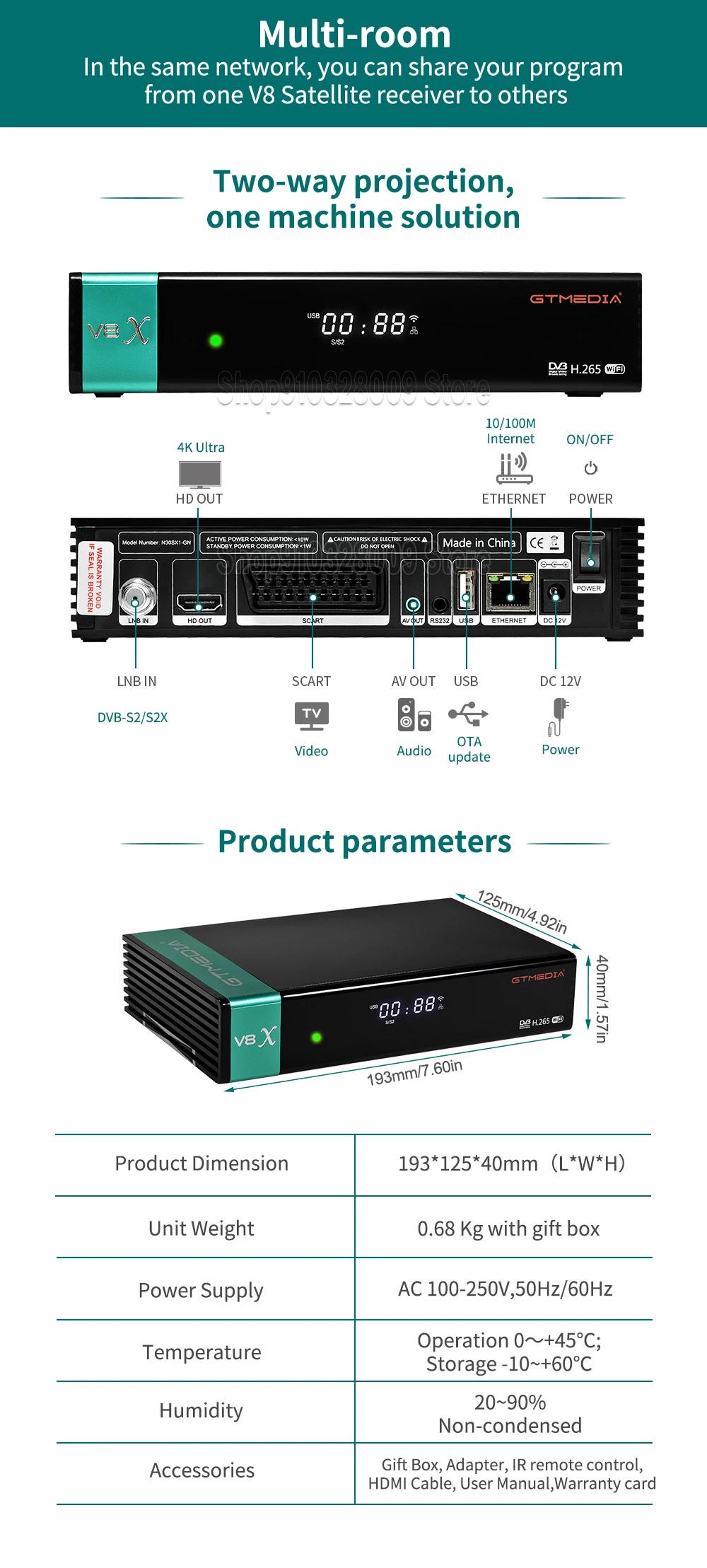 ТВ-приставка GTMEDIA V8X DVB-S2S2X, Full HD 1080P, H.265, USB, Wi-Fi