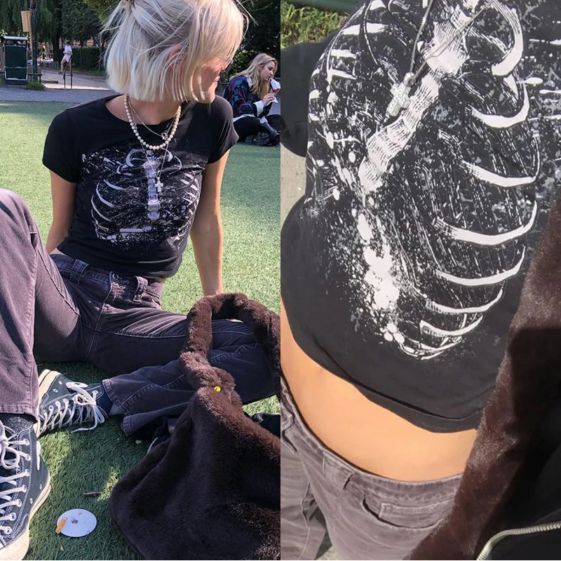 Женская трикотажная футболка, винтажная облегающая футболка в стиле Харадзюку, с принтом скелета, Y2K, в готическом стиле