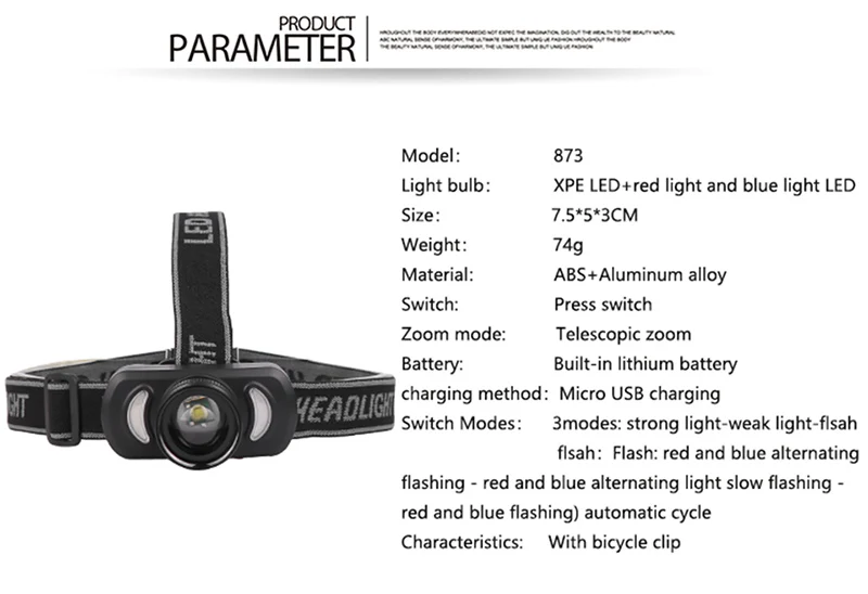 Светильник: COB светодиодныйМатериал: алюминиевый сплав + ABSАккумулятор: встроенный аккумулятор (включая аккумулятор)Режимы переключения: 3 режима: белый светильник-красный светильник-белый светильник, красный светильник поочередно мигаетПереключатель: нажмите переключательСпособ зарядки: Micro USB зарядка