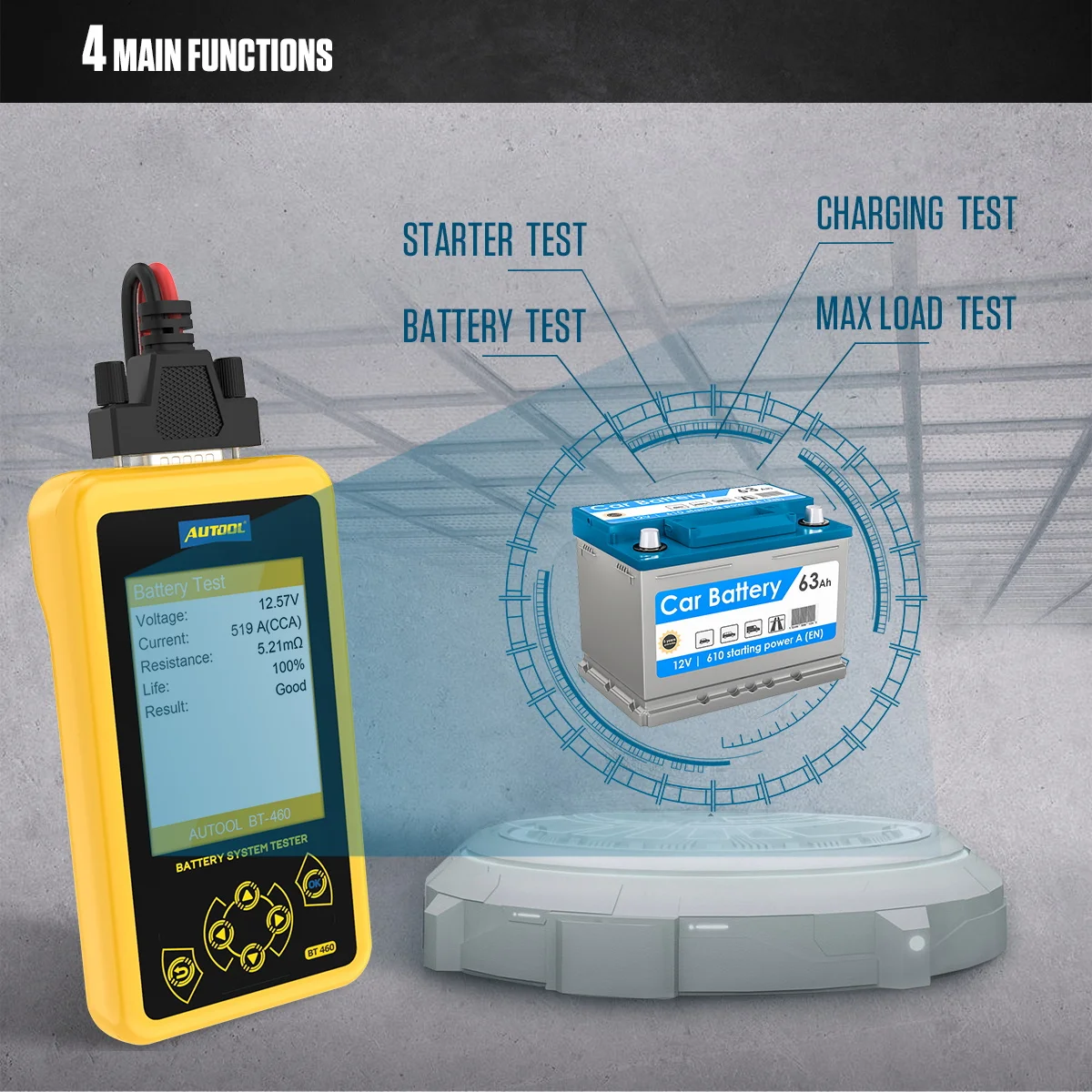 AUTOOL BT460 автомобиля Батарея нагрузки Тесты er вол Тесты 12V/24V обычный свинцово автомобильной свинцово-кислотных аккумуляторных батарей, AGM плоская пластина, AGM спираль, гель лак для ногтей, и EFB аккумуляторы. Применяя передовую технологию тестирования проводимости, BT460 может дать вам точные результаты тестирования за считанные секунды. Помещается в перчаточную коробку, она обеспечивает удобное устройство для автомобильной фабрики, гаража, производителя автомобильных аккумуляторов, профессионалов и дийеров с быстрым, простым и экономичным решением.