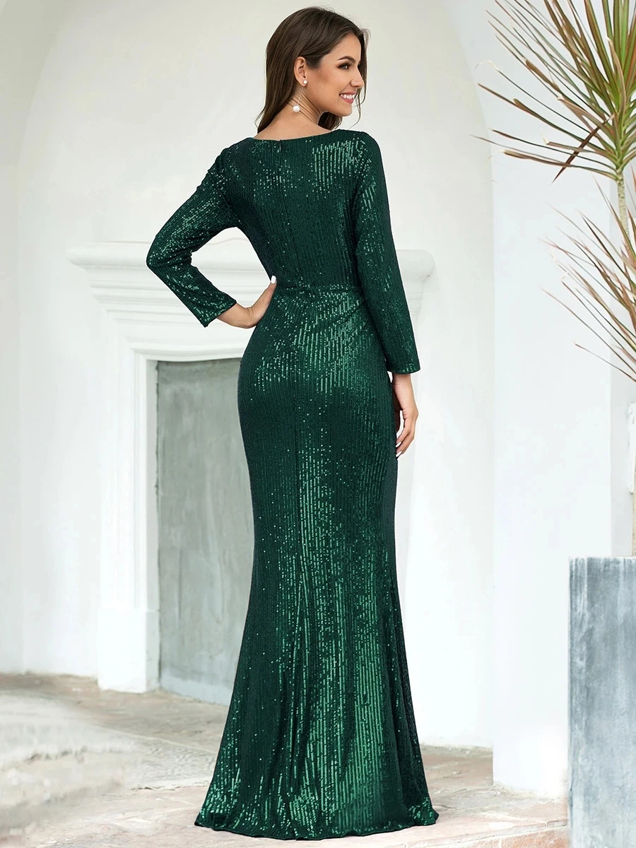 Женское вечернее платье-русалка, темно-зеленое платье с V-образным вырезом, длинным рукавом и блестками, EP00824