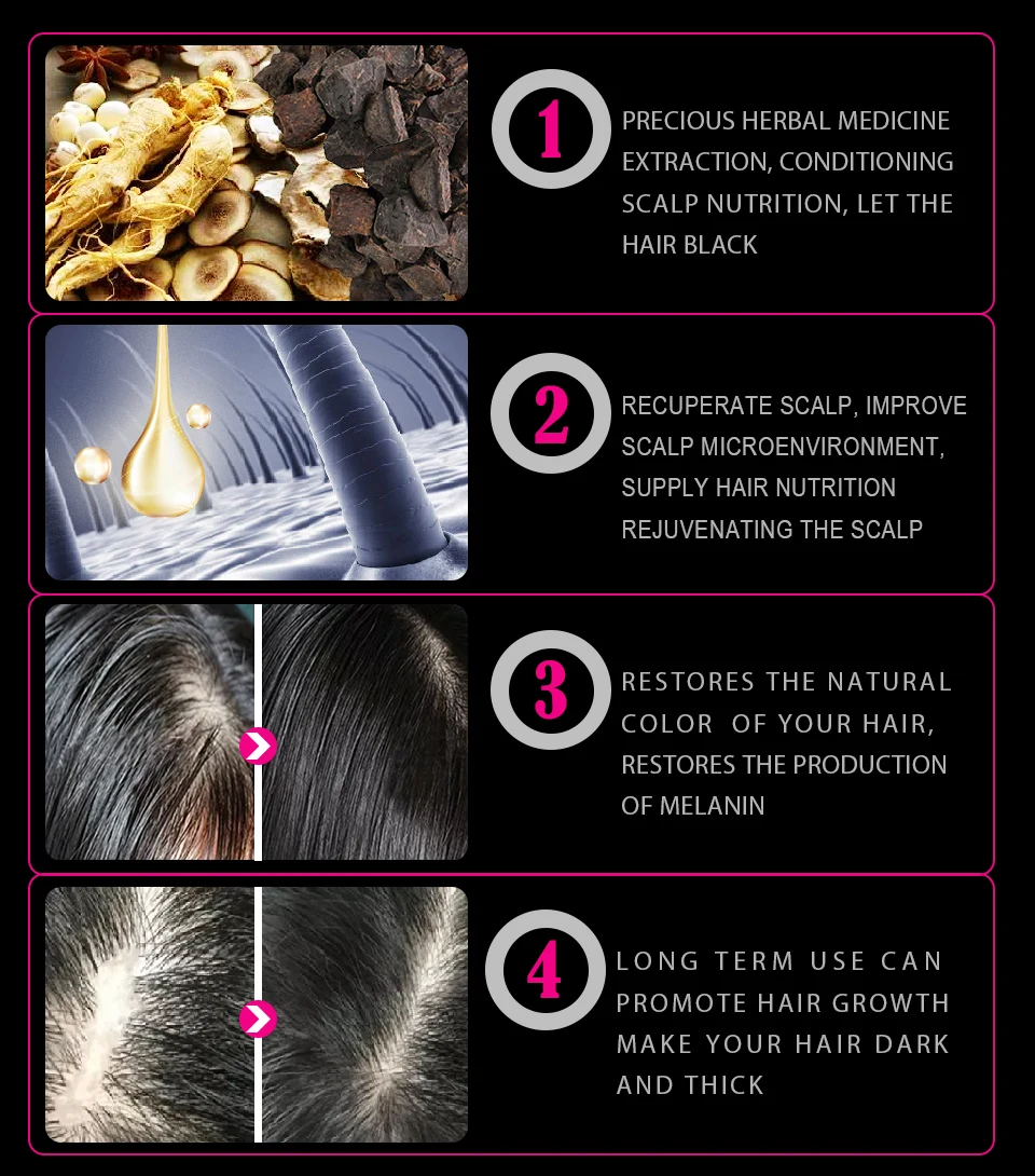 * 1. Восстанавливает естественный цвет волос;* 2. Восстановление производства меланина;* 3. Долгосрочное использование может способствовать росту волос;* 4. Подходит для всех типов и оттенков волос.