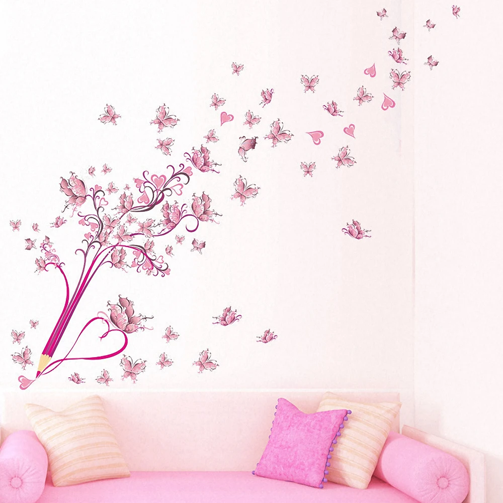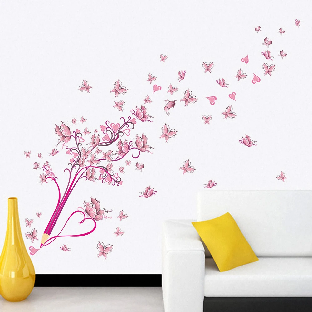 Настенный стикер с розовым карандашом, бабочкой, цветком, для спаль...