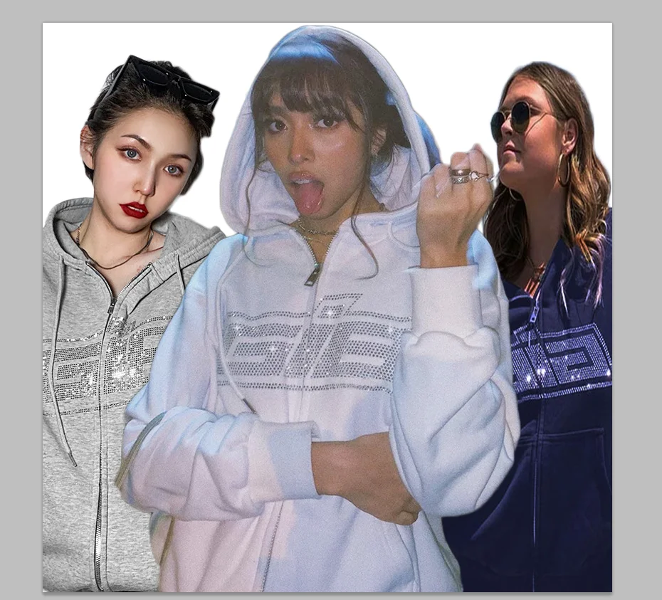 Y2K Harajuku Стразы с капюшоном на молнии в Корейском стиле свободн...