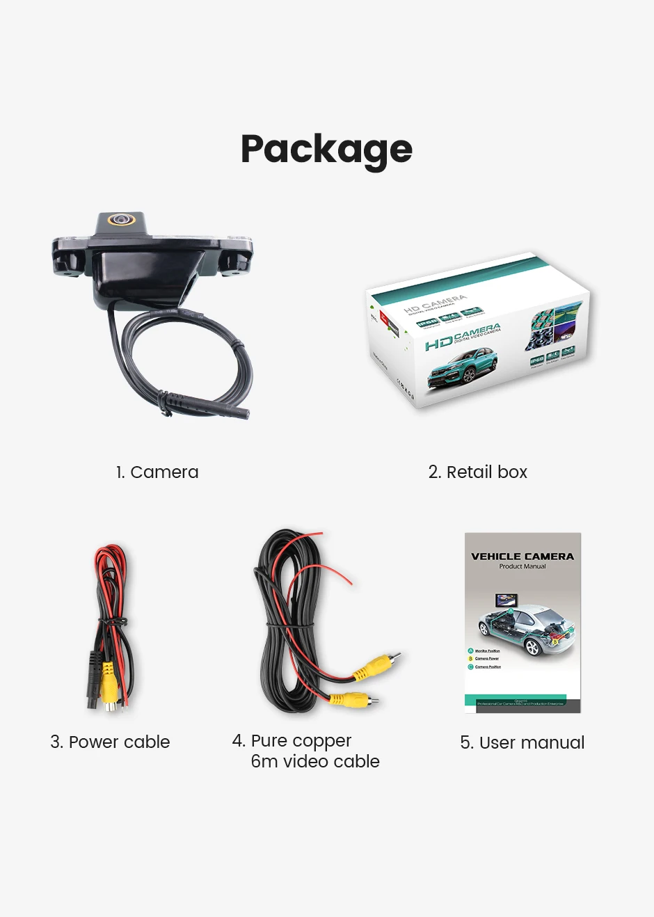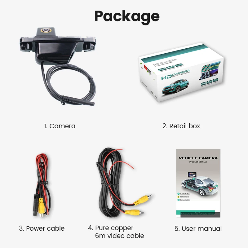 1. Камера заднего вида2. Розничная коробка3. Кабель питания4. Чистый медный 6 м видео кабель5. Руководство пользователя