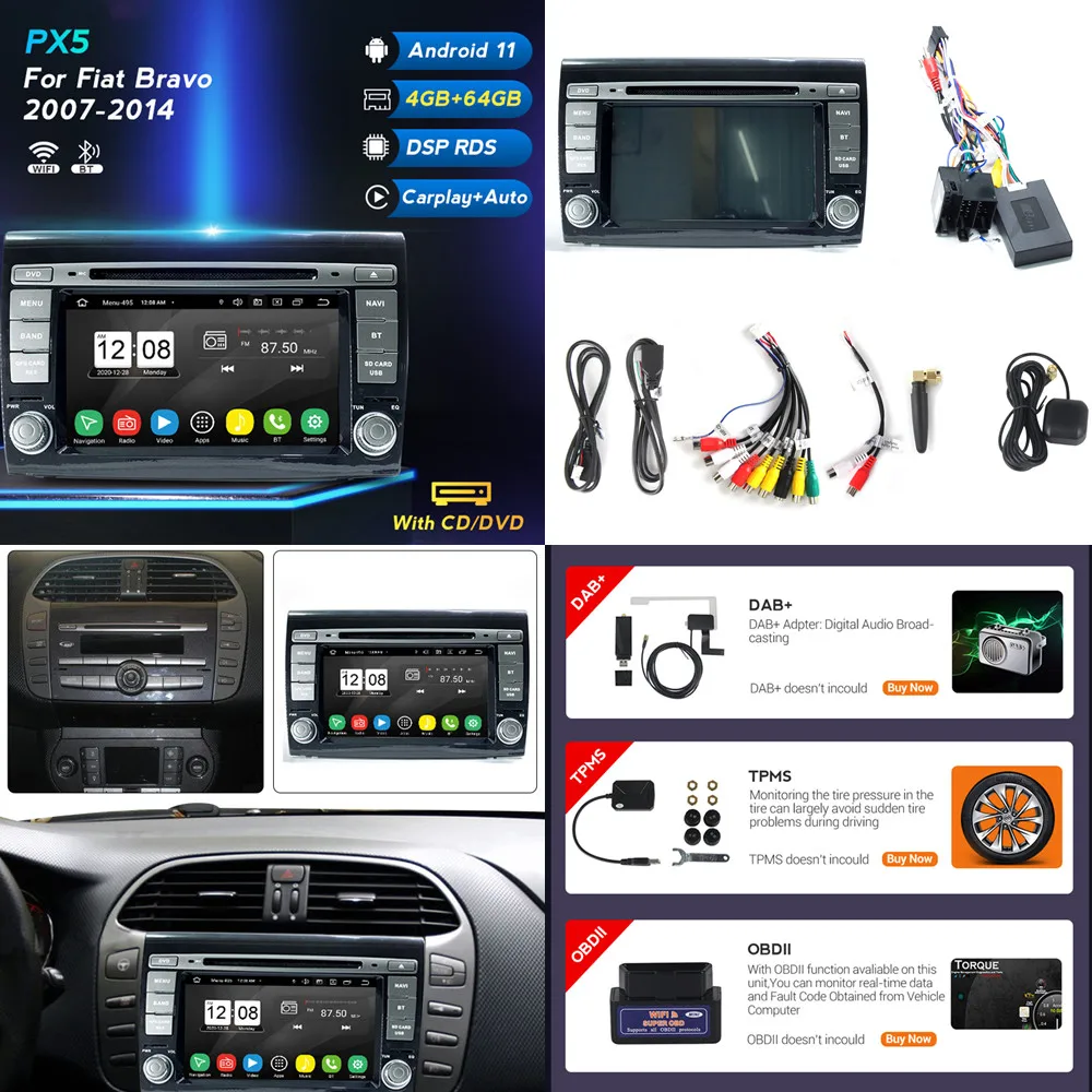 Автомобильный мультимедийный GPS-плеер на Android, 4 Гб + 64 ГБ, 2 Din, для FiatBravo 2007, 2008, 2009, 2010, 2011, 2012, GPS-навигация, DVD, радио, стерео