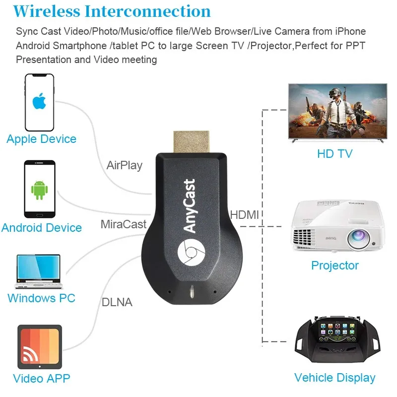 1. Aanycast используется для ЖК-телевизора/светодиодный телевизор, проектор, монитор с HDMI-совместимым входом. 2. Беспроводной дисплей поддерживает IOS ,Android OS. 3. Беспроводной ключ дисплея может передавать содержимое любого элемента с поддержкой Wi-Fi, такого как телефон/android телефон/планшет на экране телевизора. 4. Поддержка Miracast до тех пор, пока ваше устройство имеет эту функцию. 5, уникальная функция EZcast питается от vsmart, пусть обмен становится легким. 6, поддержка вывода 1080P 7. Транслируйте ваши любимые видео высокой четкости с Youtube Vimeo dailmotion ,Youku,... на большие экраны ТВ