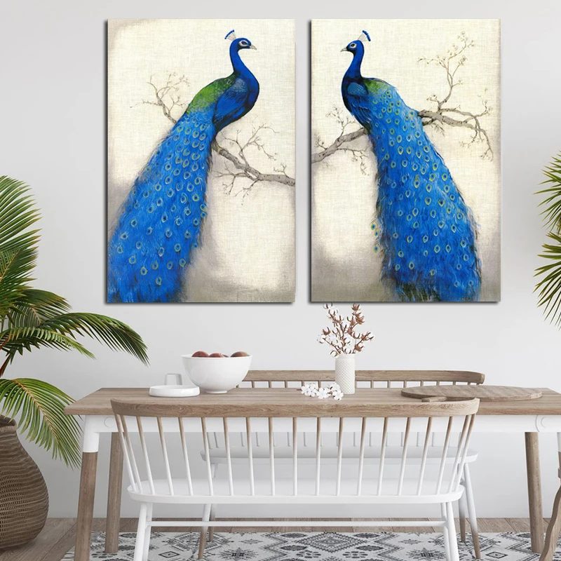 Картина на холсте с синим павлином, стоячим на дереве, в стиле ретро