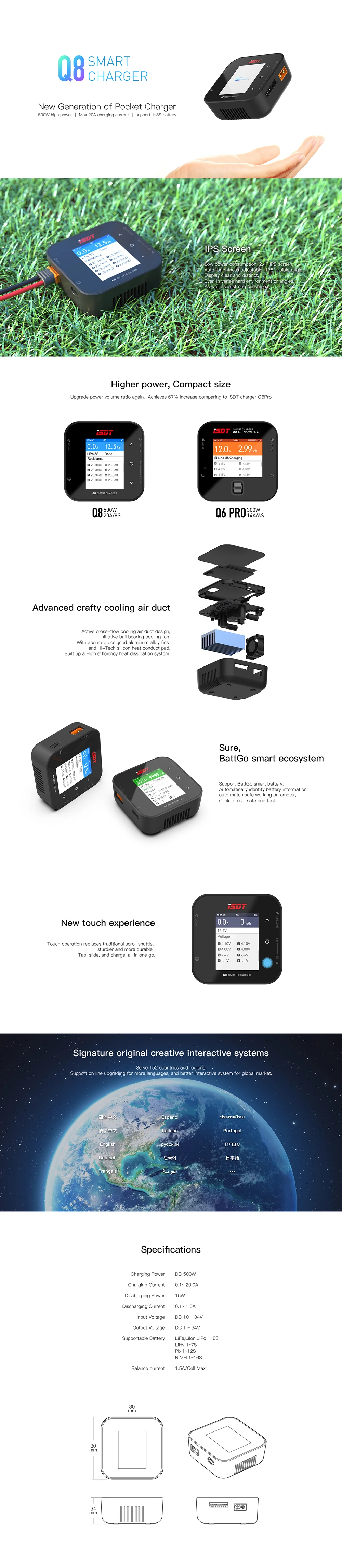 ISDT Q8 BattGo 500W 20A высокомощный аккумулятор баланс зарядное устройство Dis зарядное устройство для 1-8S Lipo батареи