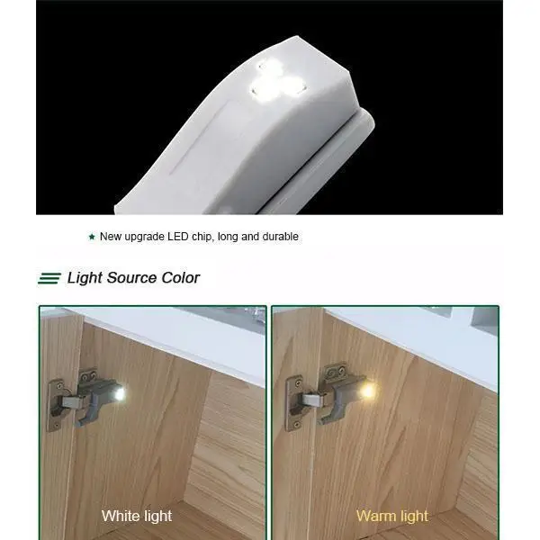 Легко установить и удобно использовать, после установки на шарнире шкафа с батареей, при открытии шкафа лампа включится автоматически. При закрытии шкафа светильник выключается
