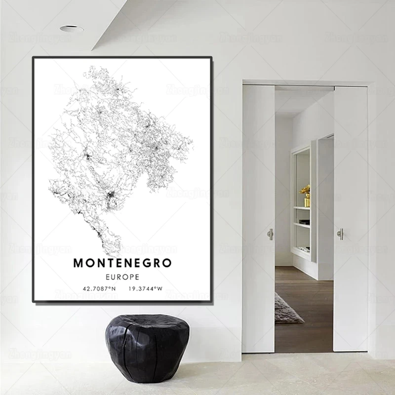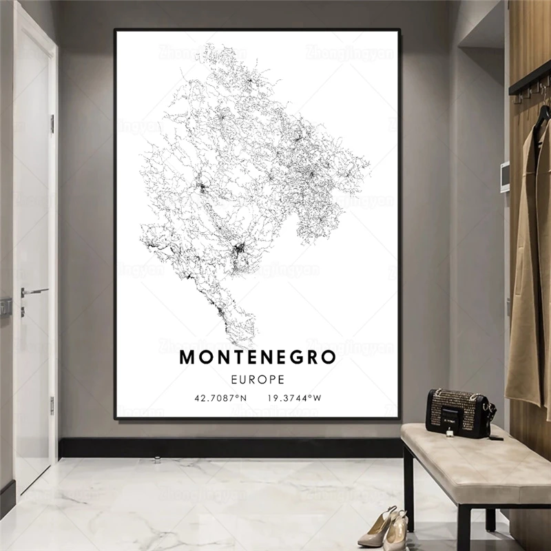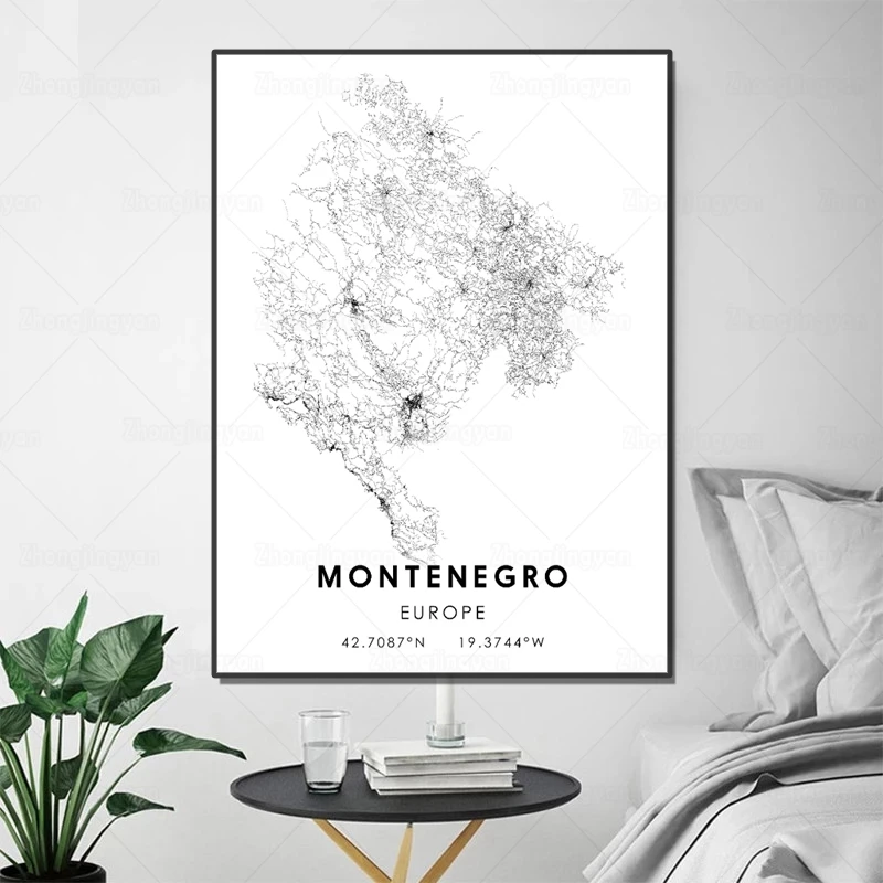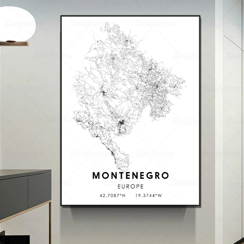 Черно-белая карта города Европа Карта города Черногории плакат HD печать настенное Искусство Холст Скандинавская картина Landspace для домашнего декора