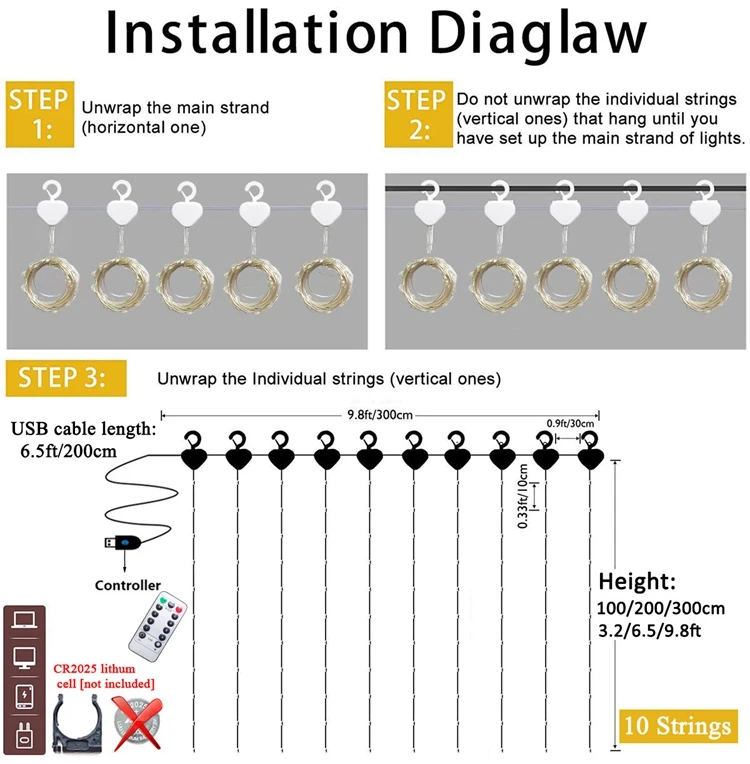 Стиль изделия: теплый белый/РазноцветныйРазмер: ширина: 3 м (9,8 футов) * Высота: 3 м (9,8 футов) с 300 светодиодамиШирина: 3 м (9,8 Фута) * Высота: 2 м (6,5 фута) с 200 светодиодамиШирина: 3 м (9,8 футов) * Высота: 1 м (3,2 фута) со 100 светодиодамиАксессуары: без крючка или с 10 крючками, два варианта.Источник питания: USB 5 В (без вилки)Срок службы: 50000 часовВодонепроницаемость: IP65, светодиодные фонари являются водонепроницаемыми, но USB не является водонепроницаемым, поэтому, пожалуйста, держите USB подальше от воды.Безопасно на ощупь: никогда не перегревайтесь после длительного использования, безопасно на ощупь.Питание от USB и пульт дистанционного управления (на пульте дистанционного управления требуются Аккумуляторы для работы, но в комплект не входит аккумулятор кнопки CR2025): непосредственно Подключите/отключите его для включения/выключения питания, и вы можете нажать кнопку на USB для настройки 8 режимов. И вы можете легко включить/выключить свет через пульт дистанционного управления, установить их в таймер для автоматического включения и выключения каждый день, настроить яркость, настроить 8 режимов настройки.Применение: Гавайские вечерние, домашние, Свадебные вечерние, украшения на день рождения, Рождество, новогодние украшенияПримечание:1. Без заглушек, без штор и без батареи CR2025.2. Поскольку Вышеуказанные размеры измеряются вручную, фактический размер, который вы получите, может немного отличаться от указанных выше размеров.3. В то же время обратите внимание, что из-за световых эффектов, яркости дисплея, настроек контрастности и т. д. могут быть некоторые незначительные различия между тоном изображения и реальным проектом.4. Для достижения эффекта изображения требуется 2 штуки освещения.