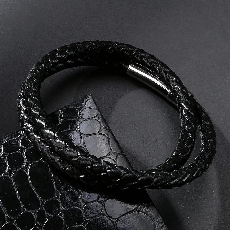 Изысканный плетеный кожаный браслет с защелками из нержавеющей стал...