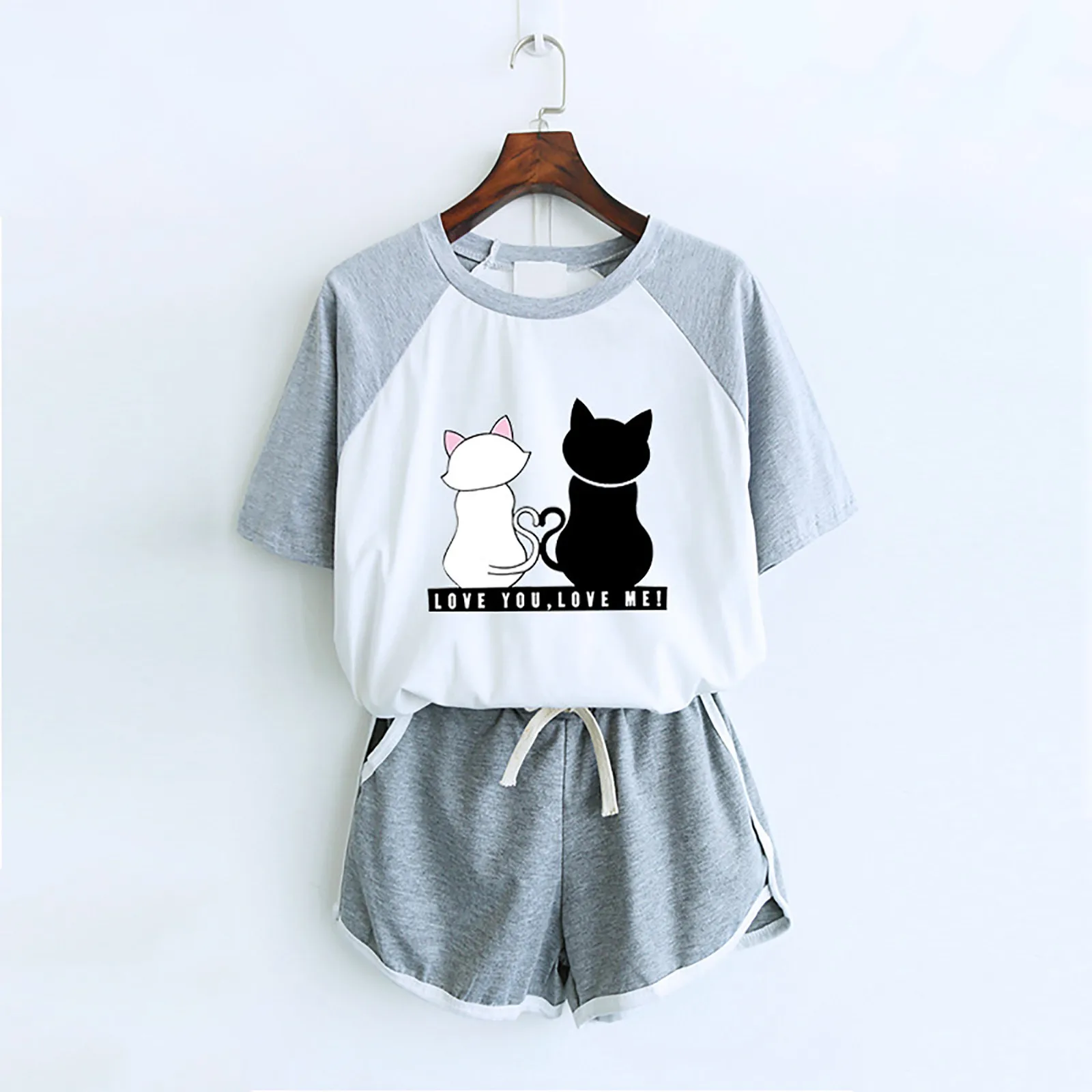 Женский пижамный комплект, летний комплект из двух предметов, топ с коротким рукавом и круглым вырезом и шорты, пижамный комплект с мультяшным принтом