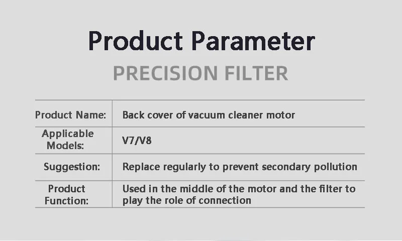 Название продукта: Задняя Крышка Двигателя ПылесосаПрименимые модели: V7/V8Предложение: регулярно заменяйте для предотвращения вторичного загрязненияФункция продукта: используется в середине двигателя и фильтра, чтобы играть роль подключения