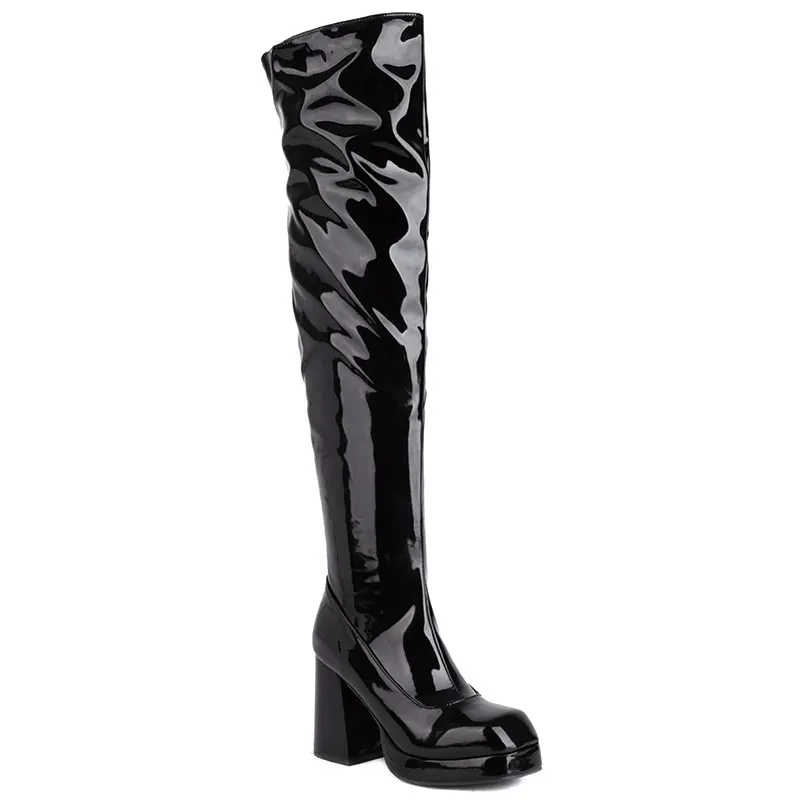 Lloprost ke лакированные кожаные сапоги выше колена на платформе на толстом высоком каблуке женские сапоги до бедра с квадратным носком и боковой молнией женские длинные сапоги
