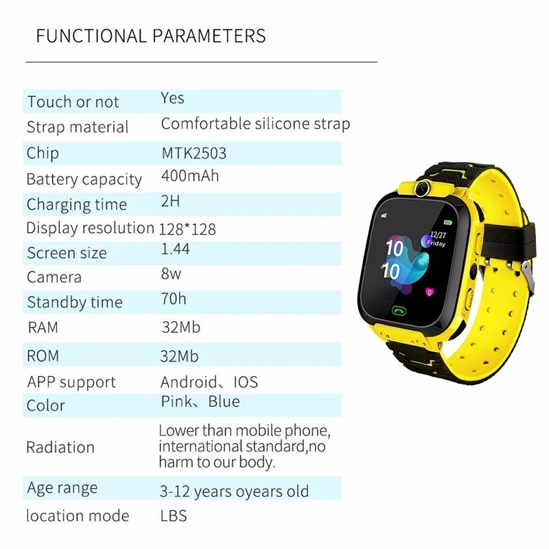 Материал ремешка: удобный силиконовый ремешок Емкость аккумулятора: 400 мАч Время зарядки: 2 ч Разрешение дисплея: 128*128 Размер экрана: 1,44 Камера: 0,3 w Время работы в режиме ожидания: 70 ч Память: 32 Мб ROM: 32 Мб Приложение: supportAndroid, 〇s Цвет: розовый, синий Излучение: ниже, чем у телефона, Международные стандарты, нет Повредит наше тело. Возраст: от 3 до 12 лет Режим положения: LBS