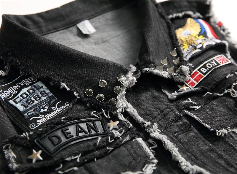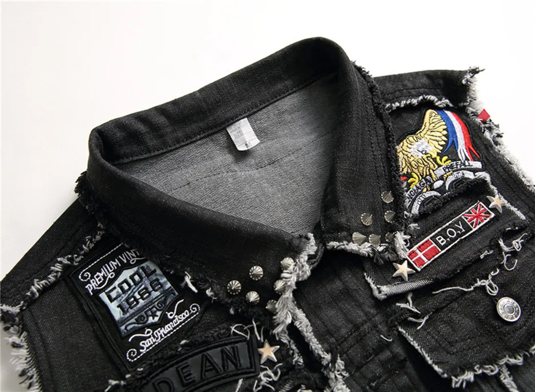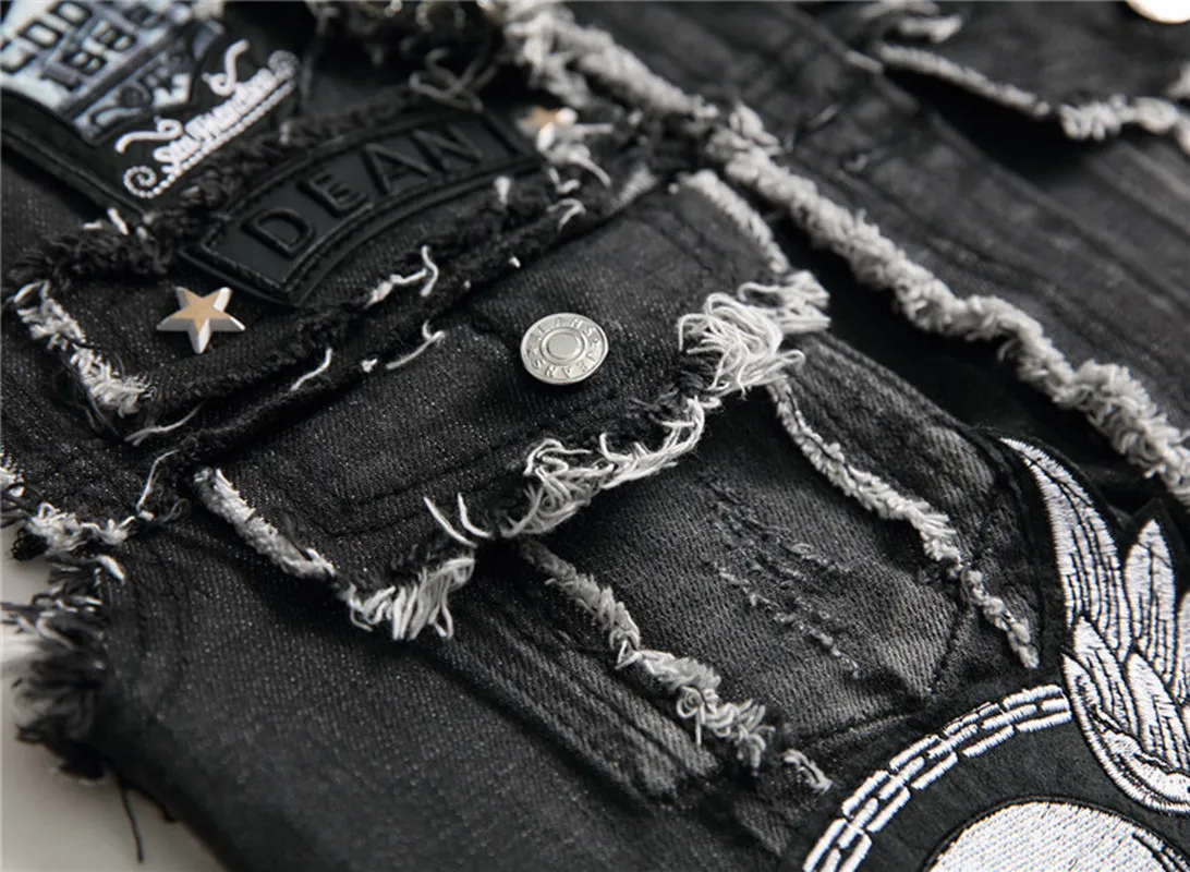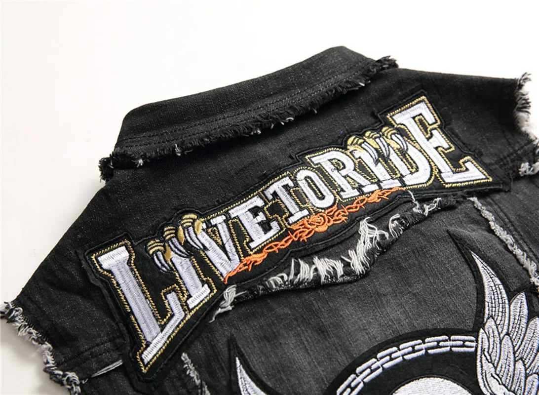 Мужской джинсовый жилет, рваный жилет с вышивкой черепа, приталенна...