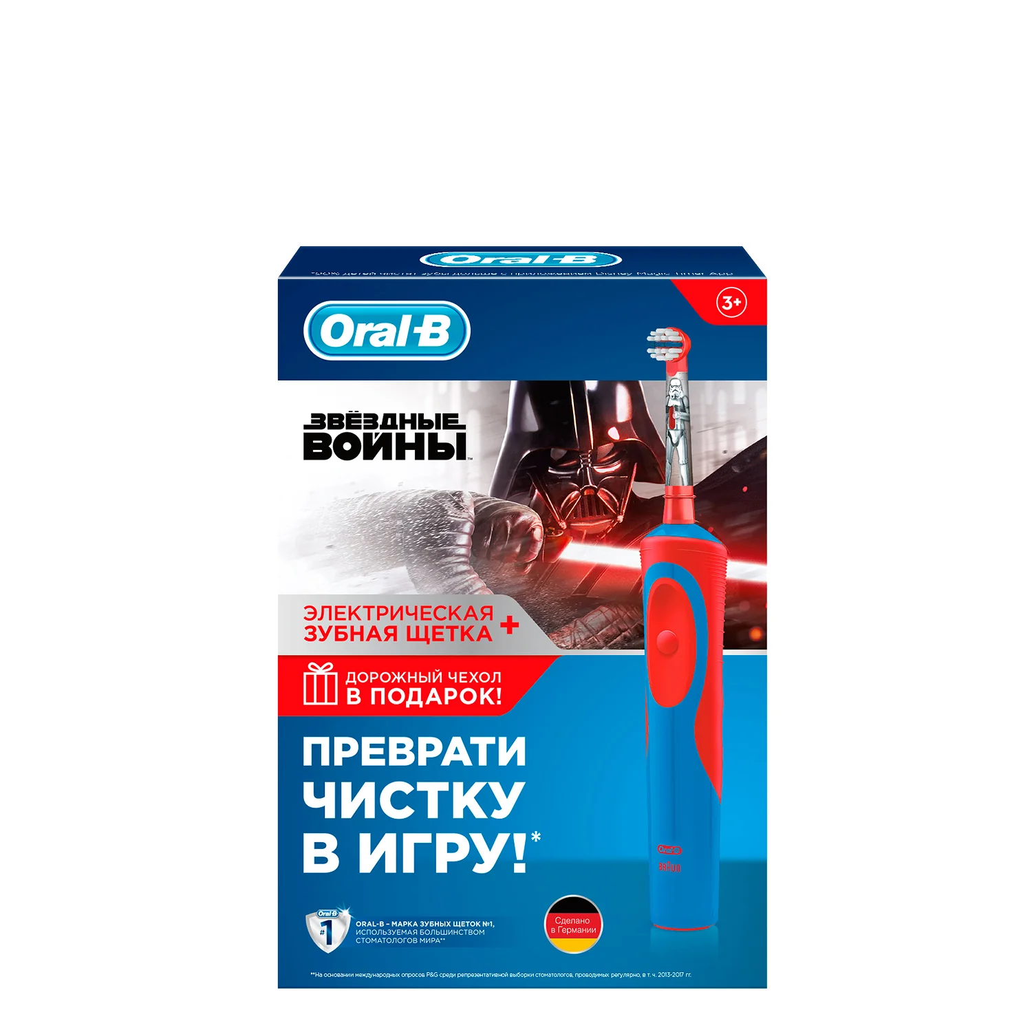 Зубная щетка Oral-B-brand No. 1, используется в большинстве стоматологов мира! * (* на основе международных исследований P & G среди стоматологов, регулярно проводящихся в T. H. 2013-2018 лет)Детская электрическая зубная щетка Oral-B stadies Power kids для мальчиков и девочек с персонажами Диснея «Звездные войны» для эффективной чистки зубов руками вашего супергероя-новичка.• Создан для тщательного ухода за полостью рта ребенка. Ультрамягкие щетинки и небольшая круглая головка, разработанная специально для детей.• 7600 возвратно-поступательных движений в минуту.• 1 Режим очистки: ежедневная Чистка с уменьшенной скоростью.• С Disney героев и волшебную 2-минутный таймер чистить зубы больше удовольствия. 90% детских зубов дольше крепятся с таймером magiс. Приложение поможет вашим детям чистить зубы, рекомендованные стоматологом в течение 2 минут, и разработать правильные привычки для ухода за полостью рта, которые останутся с ребенком на всю жизнь. Приложение позволяет создать индивидуальный профиль с вашими любимыми персонажами из Диснея, имеет таймер визуальной игры, а также систему наград за регулярную очистку и бесстрашные поездки к врачу• Перезаряжаемая батарея работает до 8 дней без подзарядки.• Рекомендуется для детей от 3 лет.• Oral-B Vitality удаляет гораздо больше зубного налета, чем обычная ручная зубная щетка, делая десны более здоровыми.• Округлые кончики щетины защищают эмаль.• Синий индикатор щетинок обесцвечивается наполовину, сигнализируя о необходимости замены насадки. Рекомендуется менять насадку один раз в 3 месяца для отличного результата.Оборудование: электрическая зубная щетка (1); Сменная мощность насадки (1); Зарядное устройство (1); Дорожный Чехол (1).