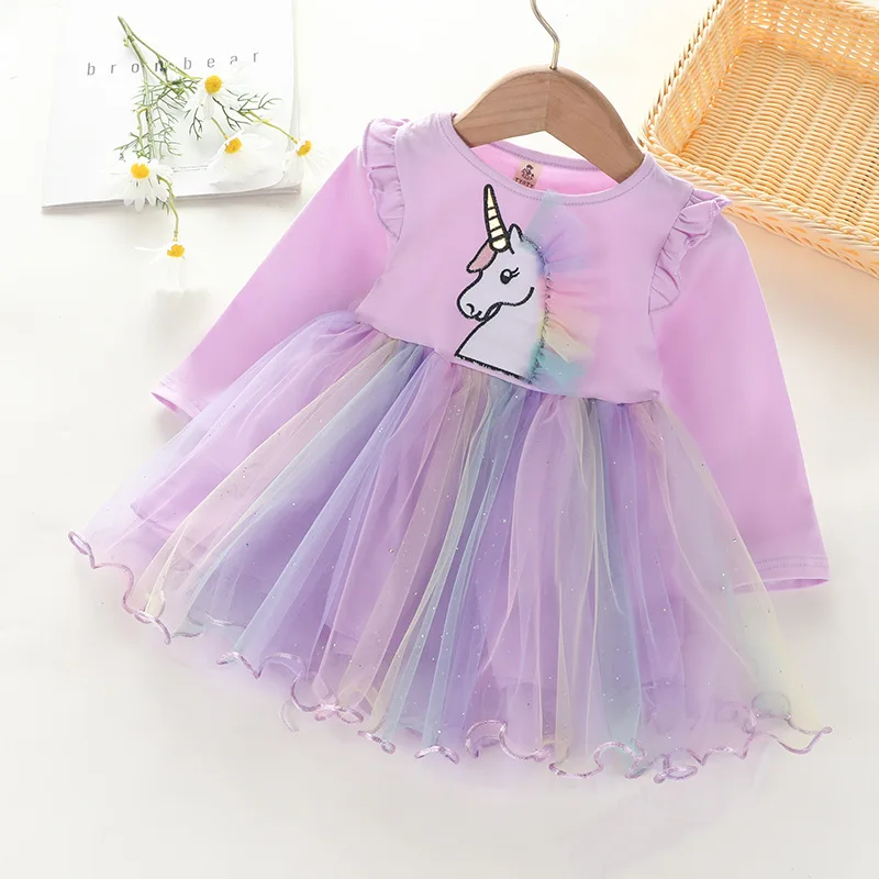 Милое платье принцессы с единорогом, весенне-осеннее детское платье с длинным рукавом для девочек
