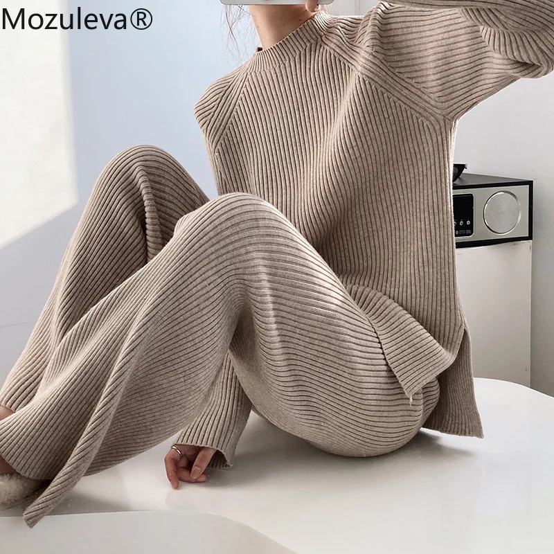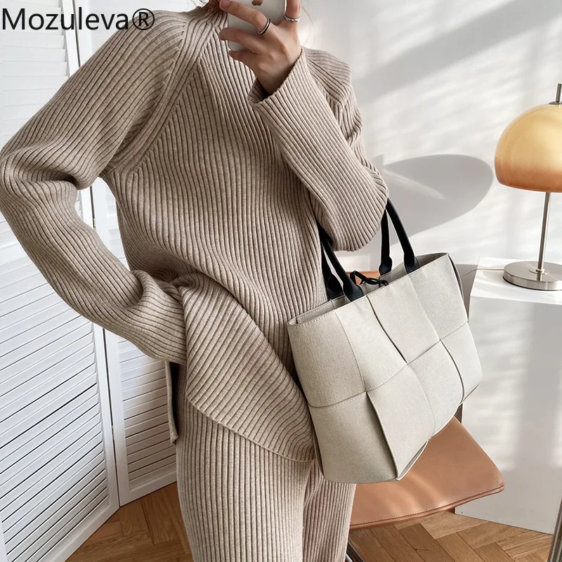 Женский Осенний вязаный комплект из 2 предметов, свитер с высоким воротником и разрезом сбоку, Свободный Повседневный Спортивный костюм с эластичным поясом