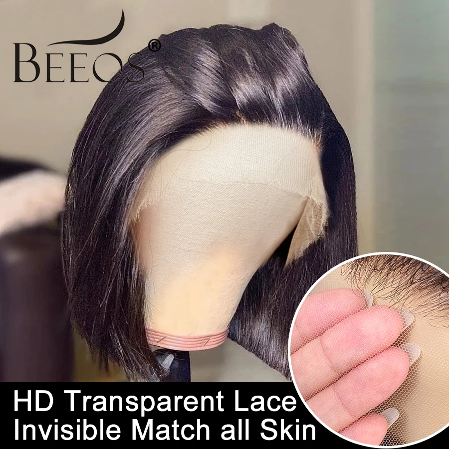 Парик Beeos 180% 13*4 HD на сетке спереди, прямые человеческие волосы, парик Боб черного цвета, парики из человеческих волос, предварительно выщипанные бразильские волосы Remy