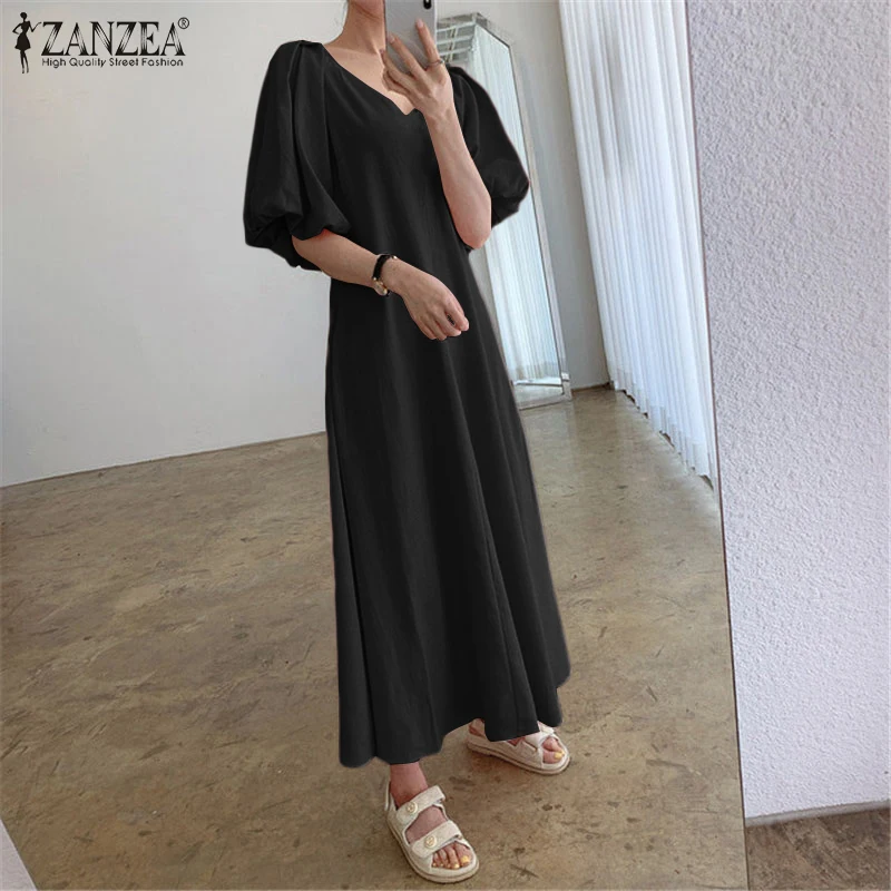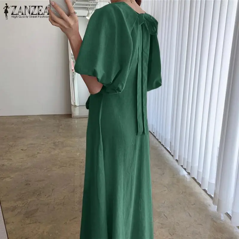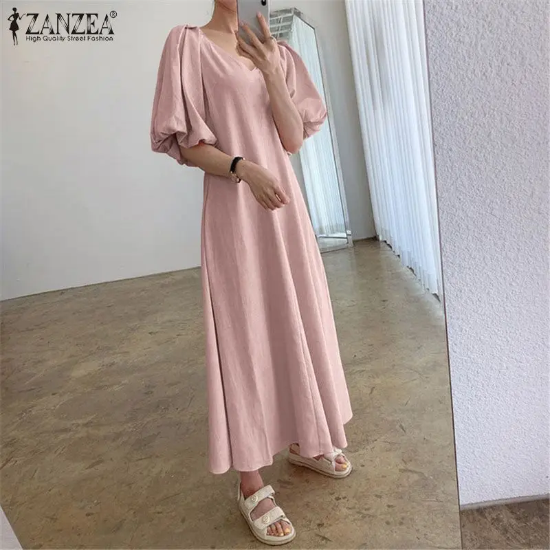Платье ZANZEA женское с V-образным вырезом, стильный Повседневный Сарафан с пышными рукавами, однотонное макси на шнуровке сзади, лето 2022
