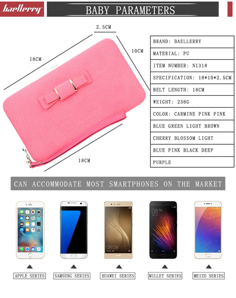 Название продукта: женский кошелекБренд: BaellerryМатериал: искусственная кожаВес: около 230 гРазмер: 18,0 см * 10,0 см * 2,5 смЦвета: 13 цветов на выборУпаковка: 1 шт.
