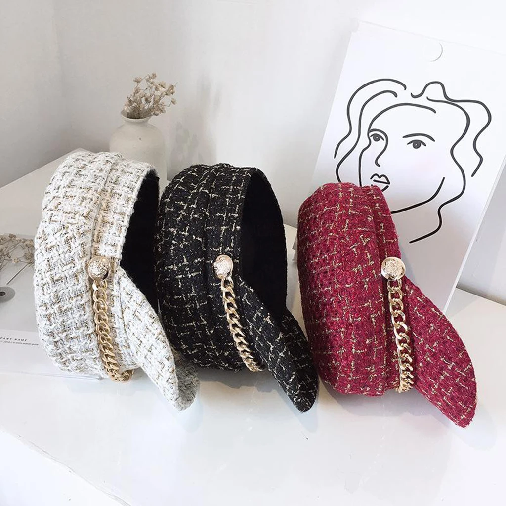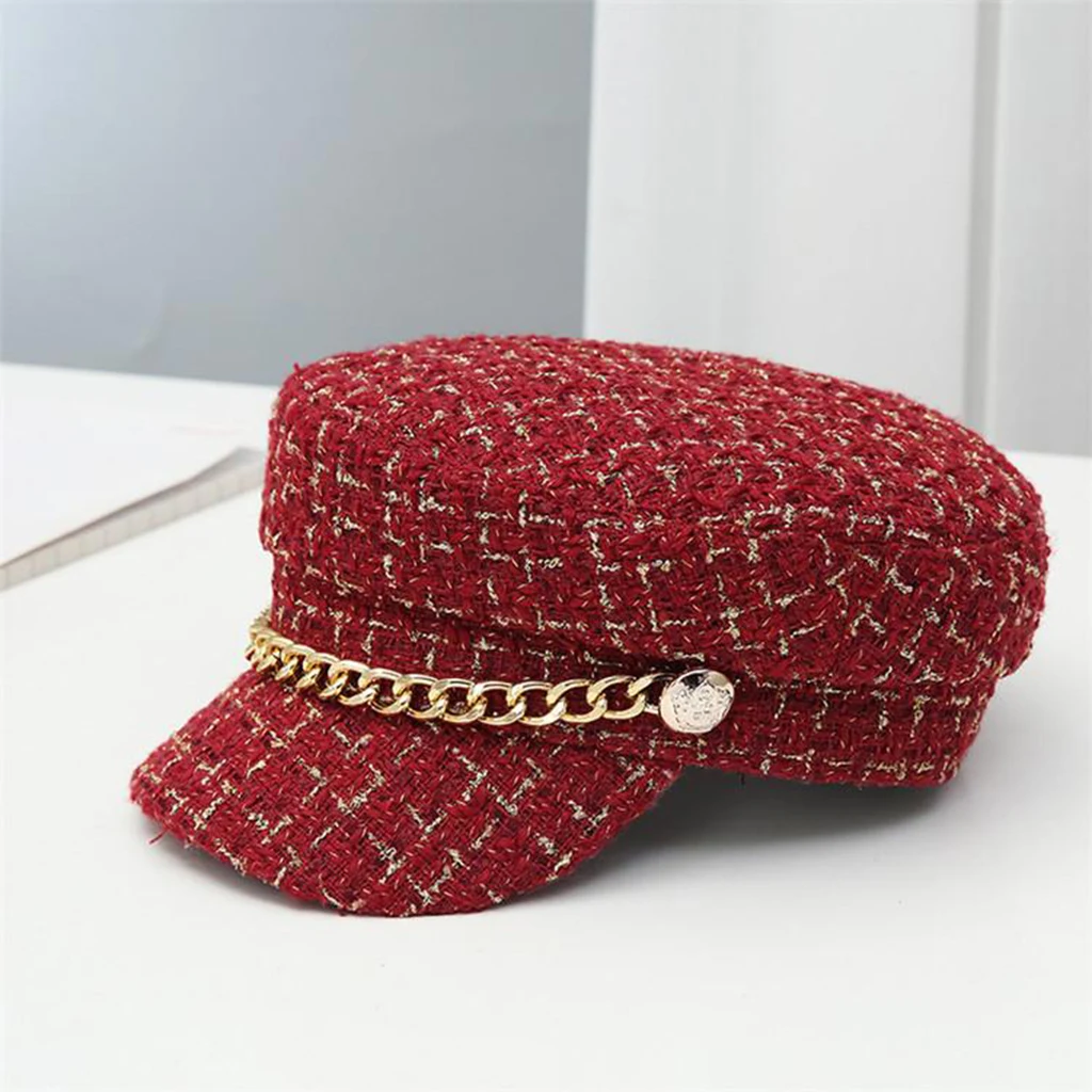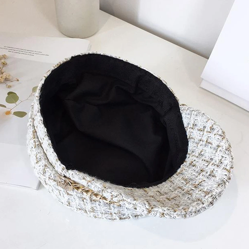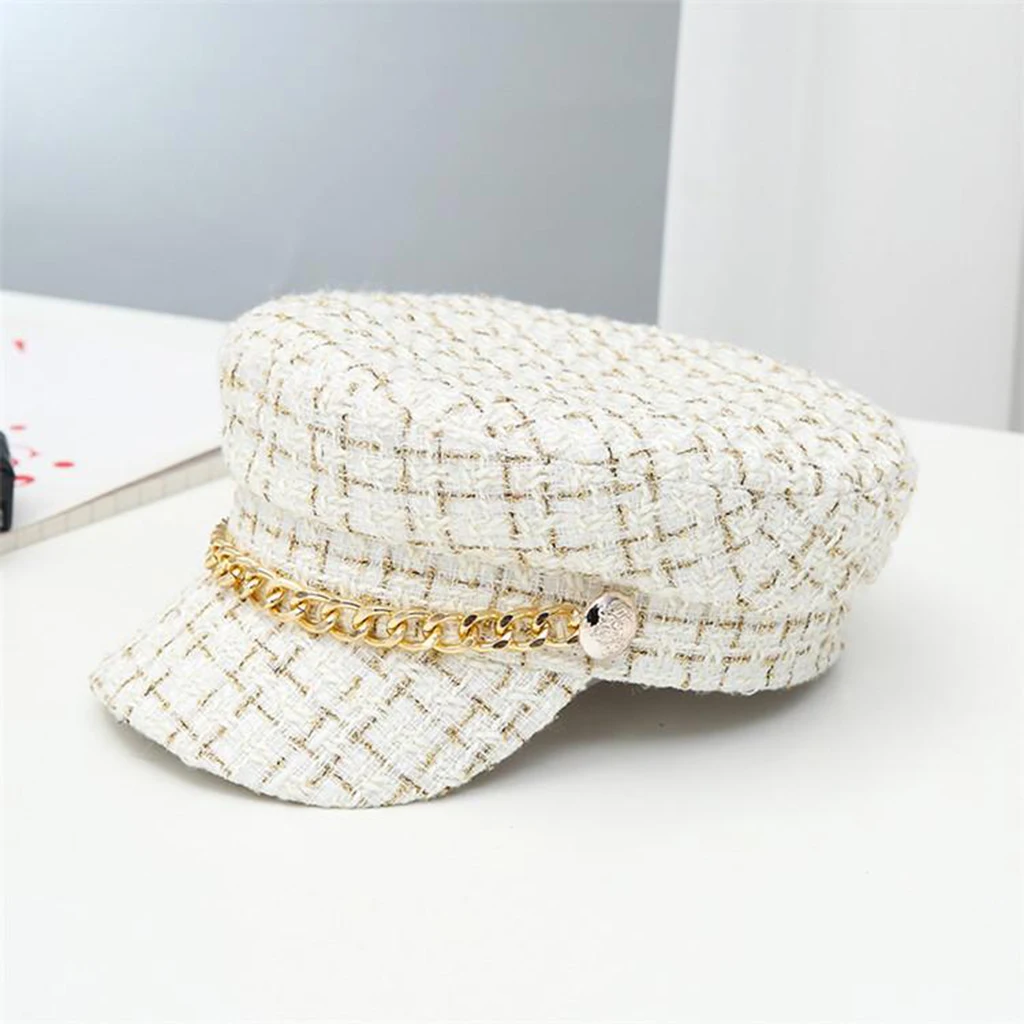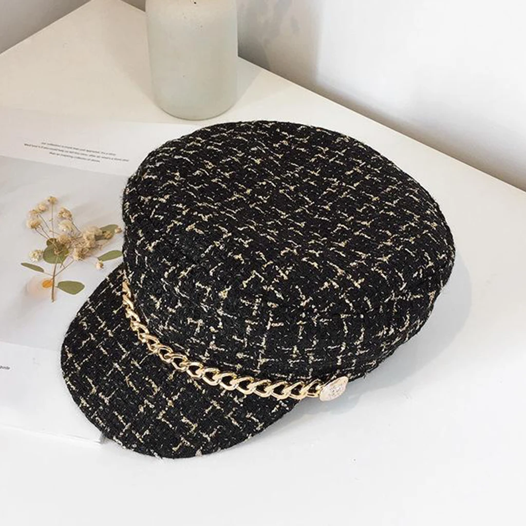 Осенне-зимняя твидовая шляпа с цепью для женщин, плоская армейская шляпа моряка, для девушек, козырек, для путешествий, береты в клетку, Newsboy Fashion