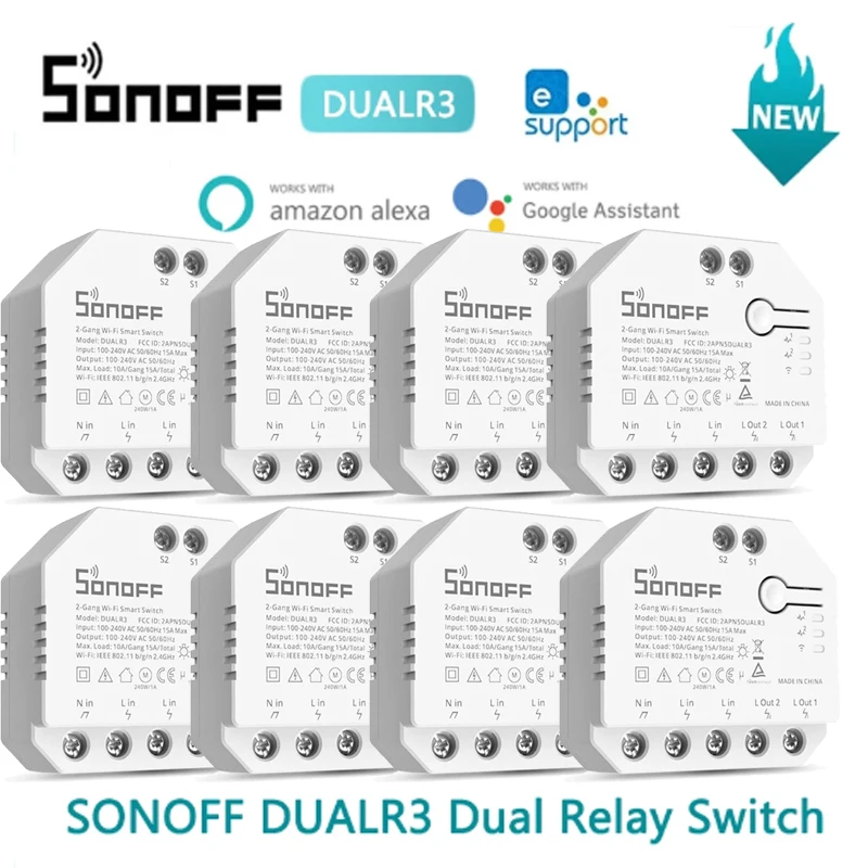 SONOFF DUALR3 выводит ваш дом на следующий уровень. DUALR3-это встроенный модуль беспроводного двойного реле Wi-Fi, который устанавливается за любым стандартным переключателем для передачи его в умный переключатель для беспроводного дистанционного управления с помощью мобильных устройств или голосовой команды. Объединяя ваши бытовые приборы в интегрированную беспроводную сеть, чтобы они общались друг с другом, что удобно для вас управлять и контролировать, включая свет, бытовую технику и моторизованный