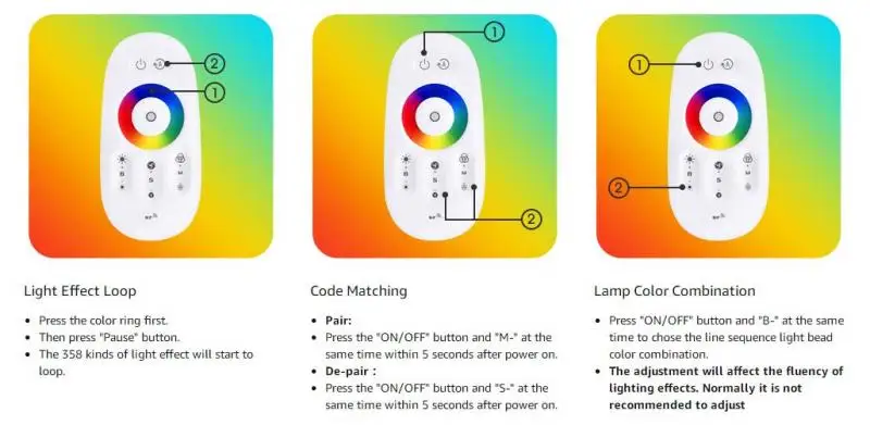 Сенсорный пульт дистанционного управления: Выберите один из нескольких цветов, когда захотите, с помощью пальца. Вы можете легко регулировать яркость, цвет или светильник на расстоянии. Максимальное рабочее расстояние составляет 98,4 футов.