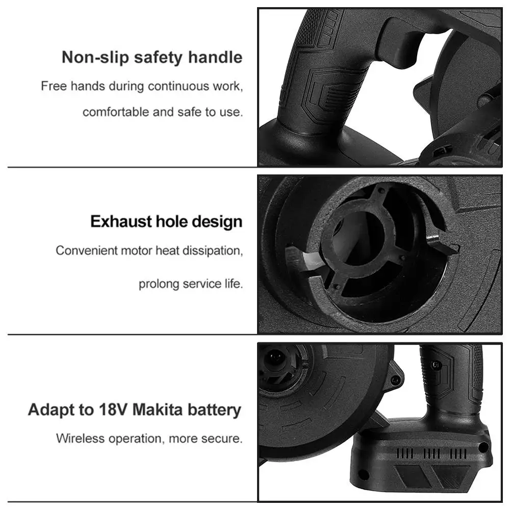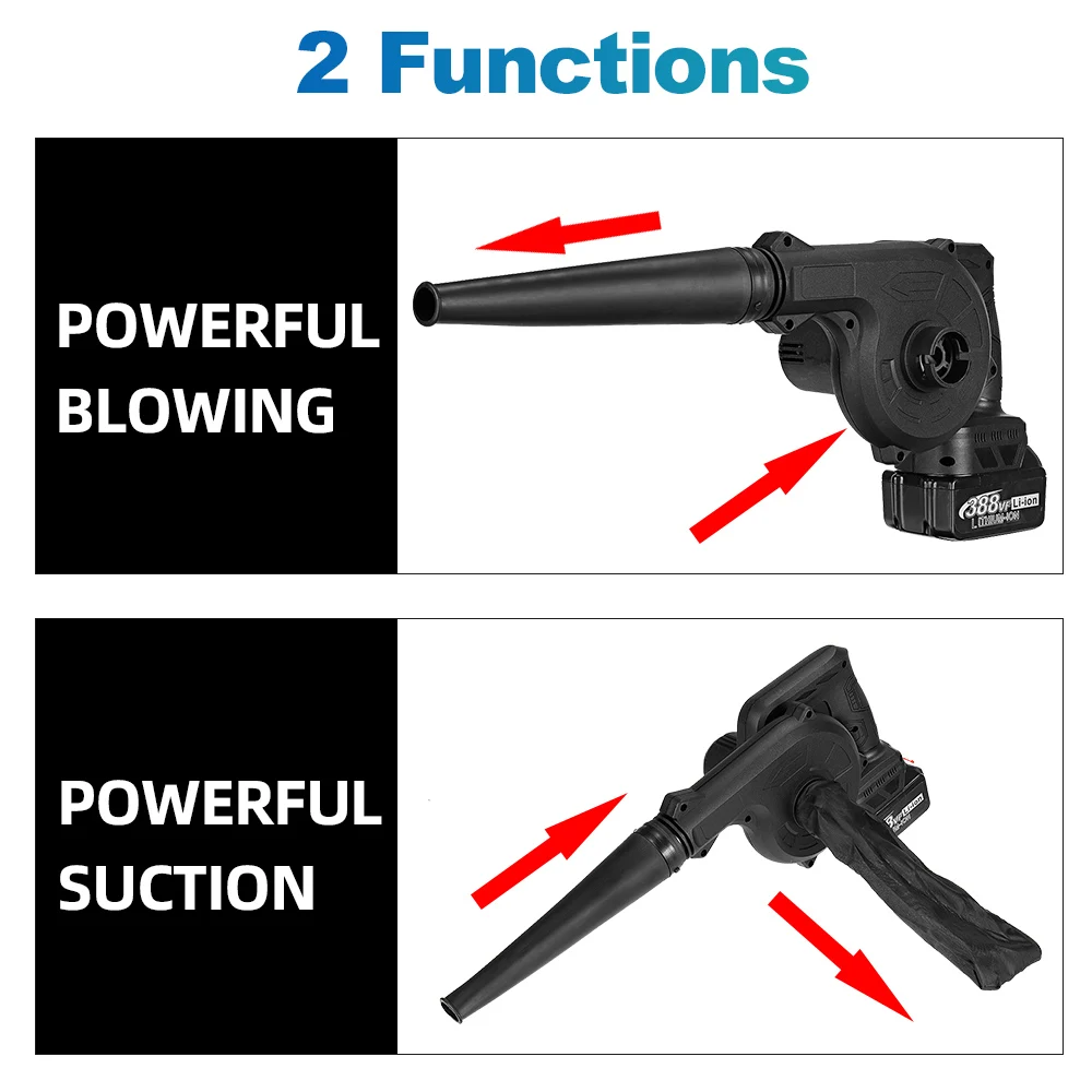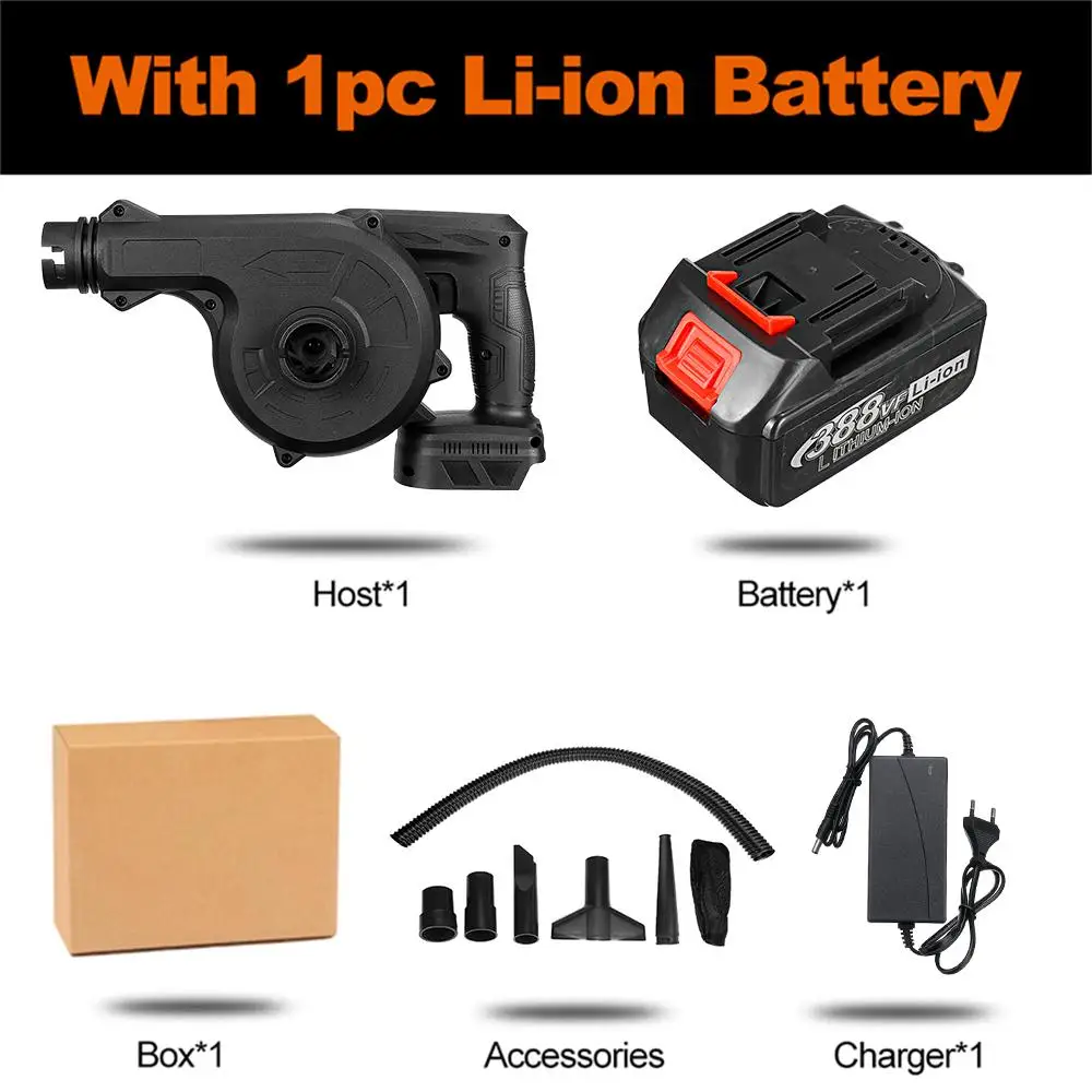 Особенности:-Функция выдувания 2 в 1 свободно контролируется, легко обрабатывается в любом уголке дома.-Сильный Интеллектуальный мотор без щеток может достичь пониженной скорости.-Высокомощный двигатель с технологией постоянной температуры используется для обеспечения стабильной работы при высокой интенсивности работы, он не устанет, даже если вы долго работаете.-Если вы измените место, где вставлено сопло, вы можете использовать его для удаления пыли и сбора пыли.-Ветровое лезвие изготовлено из хорошего пластика, который обладает повышенной прочностью и тем самым обеспечивает более сильную ветряную мощность.-Высокомощный медный сердечник обеспечивает Мощное всасывание и ветер-Компактный, легкий и простой в использовании, вентилятор быстро очищает листья и мусор.Беспроводной дизайн, эргономичный дизайн и приятная ручка, наш воздуходувка дает вам полную и удобную мобильность.-Эргономичный дизайн, нескользящая ручка, долгое время использования не повредит руки.Использование:-Очистка сельскохозяйственной техники, деревообрабатывающих машин, сбора пыли в рабочих местах, выдувания капель воды после очистки и сушки.-Очистите от пыли Материнские платы, чехол компьютера и источник питания. Легко очищает пыль/волосы от постельных принадлежностей, углов, днища кровати, Ковров, мебели и т. Д.