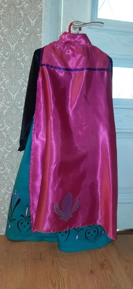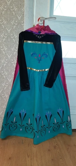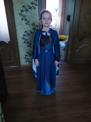 Платье оправдало ожидание. на рост 134 взяла максимальный здесь -150 см (9-10т). дочке немного свободно, длина до щиколотки, по полу не везется, плечи и талия на месте, ткань красивая, при ходьбе красиво развевается. накидка тоже хорошая, завязки хлипковаты. они сделаны из этой же ткани, как и платье, поэтому боюсь, что при более тугом завязывании у них разорвутся нитки, которыми они прострочены. Цвет в реале более синий, чем зелёный, но тоже красивый. купили заранее на Новый год.