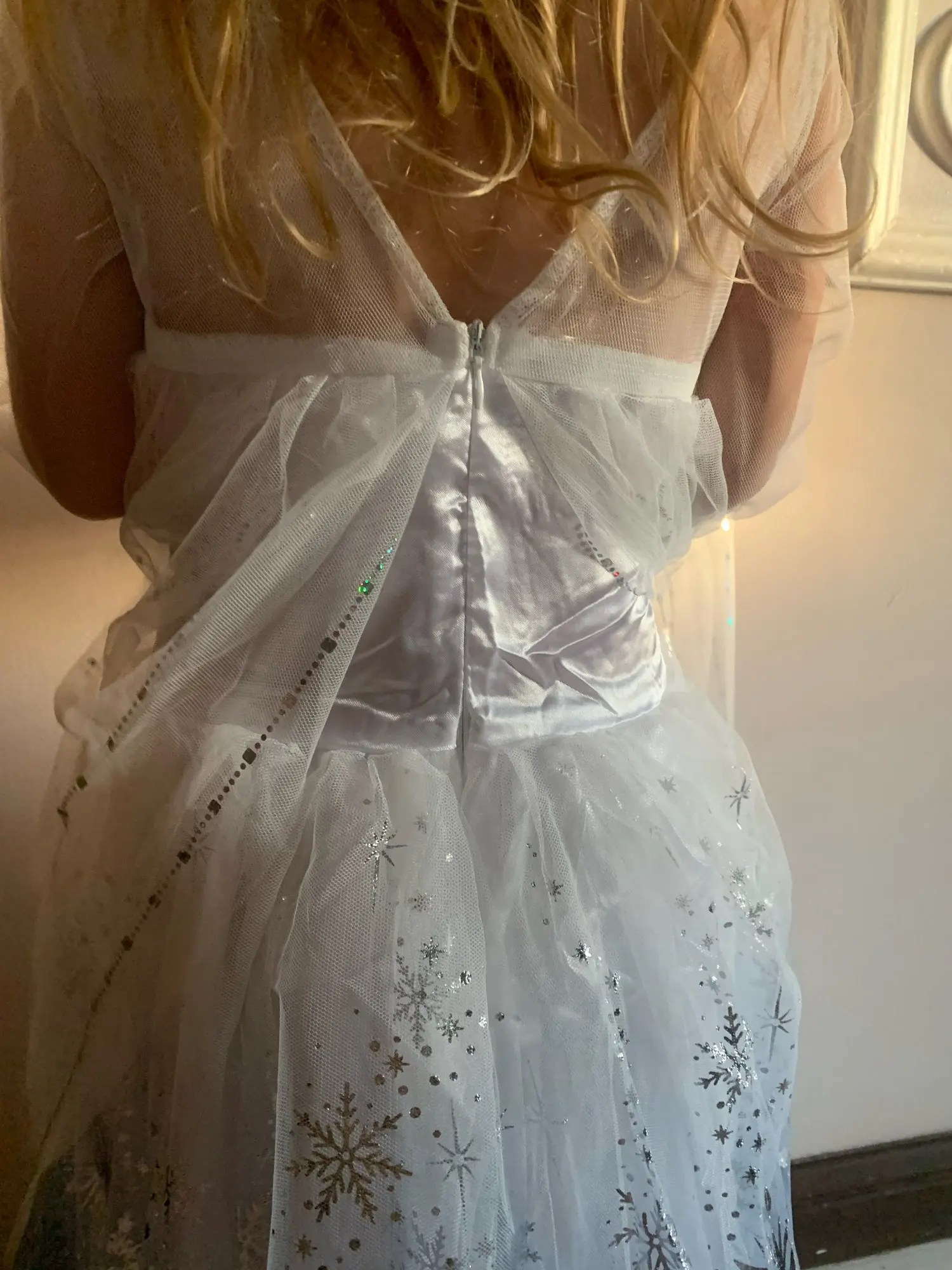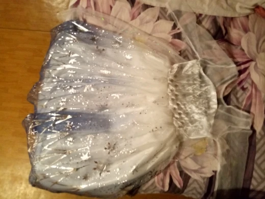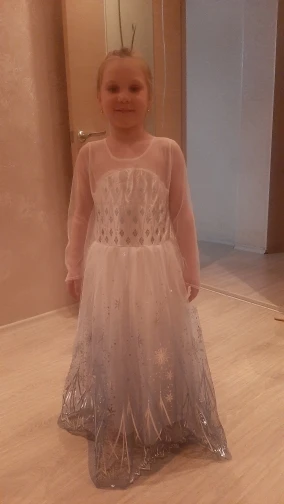 Платье пришло очень быстро: заказали 8.11, получили уже 22.11. Качество очень хорошее, нитки только на прикрепляющемся шлейфе немного торчат. На рост ребенка 134 см подошел размер 140 (7-8Т). По ширине немного свободно, но мы худенькие. Нижняя часть платья из трех юбок - две верхние из фатина и нижняя хлопок, немного просвечивают. Продавца однозначно рекомендую! Спасибо!