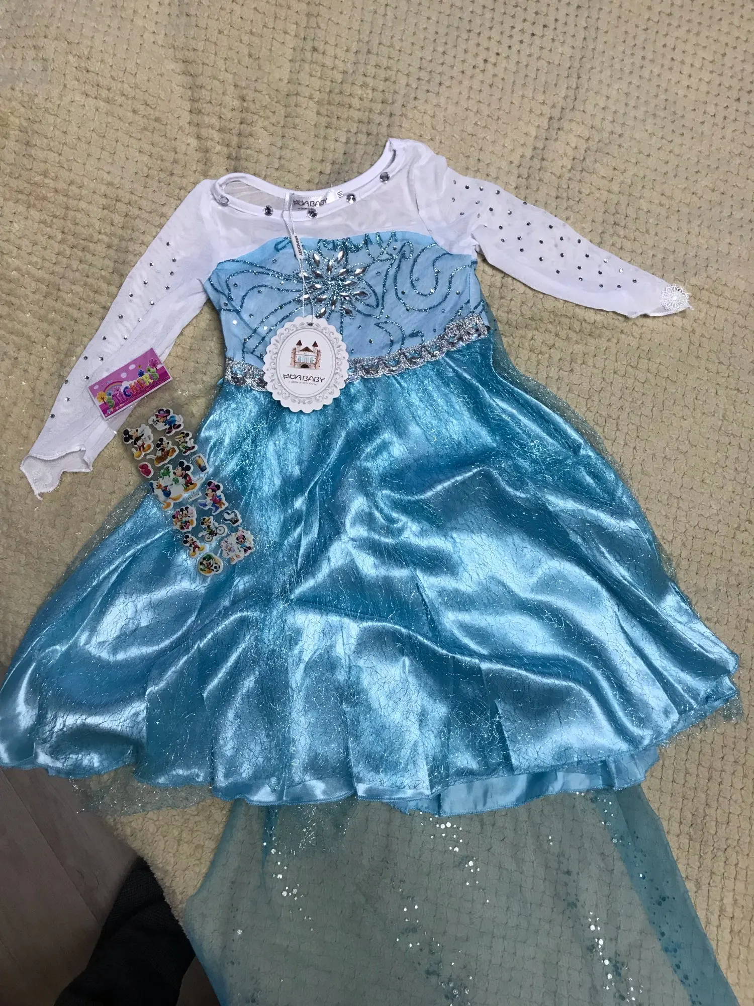 Пришло за 10 дней на почту, я очень удивлена! Платье из красивых, тонких тканей. плюс продавец положил наклеечки с Микки Маусом. Размер 130 брала на рост 122см(22кг). по длине вроде в целом неплохо, по ширине широко в талии и в рукавах. Спинка очень открытая, хочется чем-то стянуть вырез. Подойдёт для более пухленьких девочек) а мы чего-нибудь придумаем, чтобы так не было.